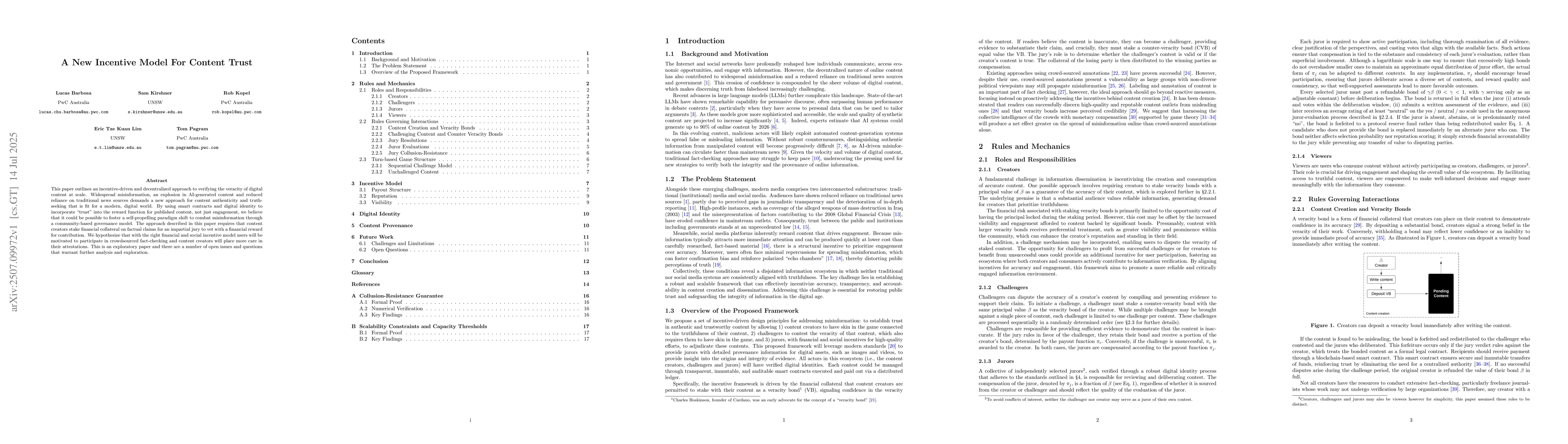 This paper outlines an incentive-driven and decentralized approach to verifying the veracity of digital content at scale. Widespread misinformation, an explosion in AI-generated content and reduced reliance on traditional news sources demands a new approach for content authenticity and truth-seeking that is fit for a modern, digital world. By using smart contracts and digital identity to incorporate 'trust' into the reward function for published content, not just engagement, we believe that it could be possible to foster a self-propelling paradigm shift to combat misinformation through a community-based governance model. The approach described in this paper requires that content creators stake financial collateral on factual claims for an impartial jury to vet with a financial reward for contribution. We hypothesize that with the right financial and social incentive model users will be motivated to participate in crowdsourced fact-checking and content creators will place more care in their attestations. This is an exploratory paper and there are a number of open issues and questions that warrant further analysis and exploration.