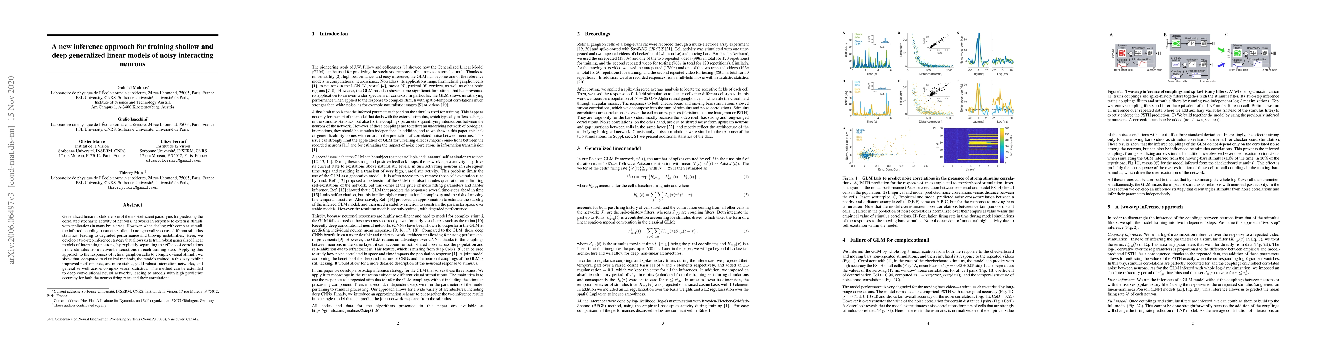This paper introduces a novel two-step inference method for training generalized linear models of noisy interacting neurons, which separates stimulus correlations from network interactions. The approach enhances model robustness, stability, and generalization, particularly for retinal ganglion cells responding to complex visual stimuli.