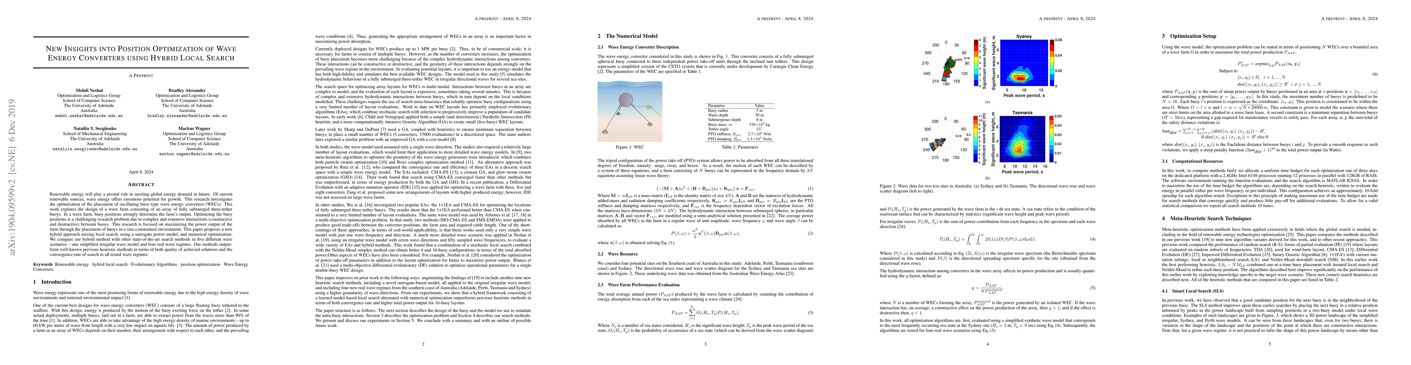 Renewable energy, such as ocean wave energy, plays a pivotal role in addressing the tremendous growth of global energy demand. It is expected that wave energy will be one of the fastest-growing energy resources in the next decade, offering an enormous potential source of sustainable energy. This research investigates the placement optimization of oscillating buoy-type wave energy converters (WEC). The design of a wave farm consisting of an array of fully submerged three-tether buoys is evaluated. In a wave farm, buoy positions have a notable impact on the farm's output. Optimizing the buoy positions is a challenging research problem because of very complex interactions (constructive and destructive) between buoys. The main purpose of this research is maximizing the power output of the farm through the placement of buoys in a size-constrained environment. This paper proposes a new hybrid approach of the heuristic local search combined with a numerical optimization method that utilizes a knowledge-based surrogate power model. We compare the proposed hybrid method with other state-of-the-art search methods in five different wave scenarios -- one simplified irregular wave model and four real wave climates. Our method considerably outperforms all previous heuristic methods in terms of both quality of achieved solutions and the convergence-rate of search in all tested wave regimes.