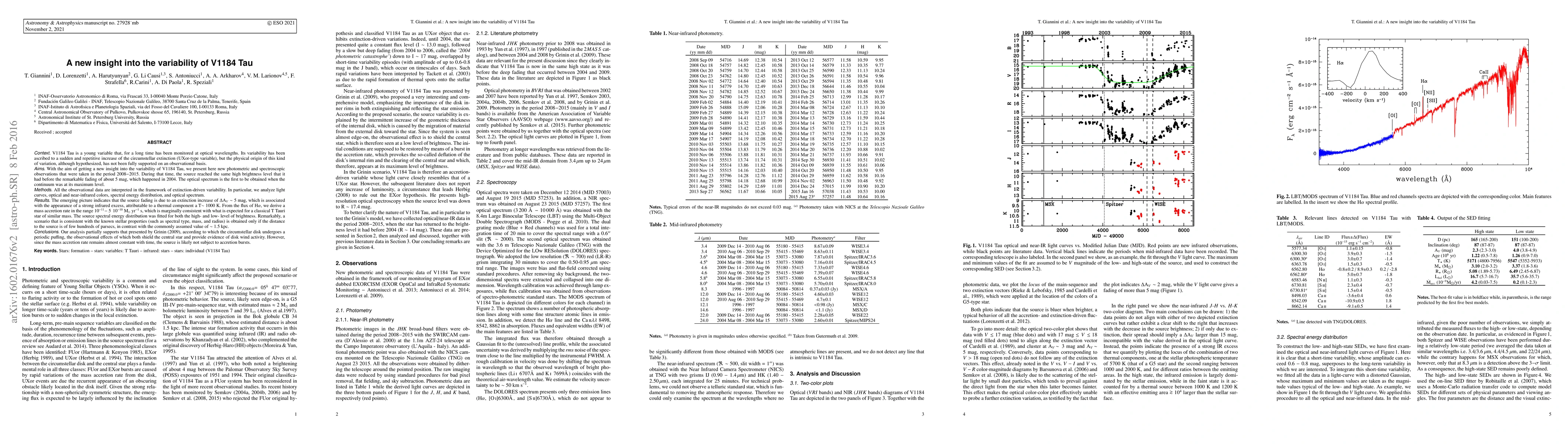 V1184 Tau is a young variable for long time monitored at optical wavelengths. Its variability has been ascribed to a sudden and repetitive increase of the circumstellar extinction (UXor-type variable), but the physical origin of such variation, although hypothesized, has not been fully supported on observational basis. To get a new insight into the variability of V1184 Tau, we present new photometric and spectroscopic observations taken in the period 2008-2015. During these years the source has reached the same high brightness level that had before the remarkable fading of about 5 mag undergone in 2004. The optical spectrum is the first obtained when the continuum is at its maximum level. The observations are interpreted in the framework of extinction driven variability. We analyze light curves, optical and near-infrared colors, SED and optical spectrum. The emerging picture indicates that the source fading is due to an extinction increase of DeltaA_V about 5 mag, associated with a strong infrared excess, attributable to a thermal component at T=1000 K. From the flux of H(alpha) we derive a mass accretion rate between 10^-11 -5 10^-10 M_sun yr^-1 s, consistent with that of classical T Tauri stars of similar mass. The source SED was fitted for both the high and low level of brightness. A scenario consistent with the known stellar properties (such as spectral type, mass and radius) is obtained only if the distance to the source is of few hundreds of parsecs, in contrast with the commonly assumed value of 1.5 kpc. Our analysis partially supports that presented by Grinin (2009), according to which the circumstellar disk undergoes a periodical puffing, whose observational effects are both to shield the central star and to evidence a disk wind activity. However, since the mass accretion rate remains almost constant with time, the source is likely not subject to accretion bursts.