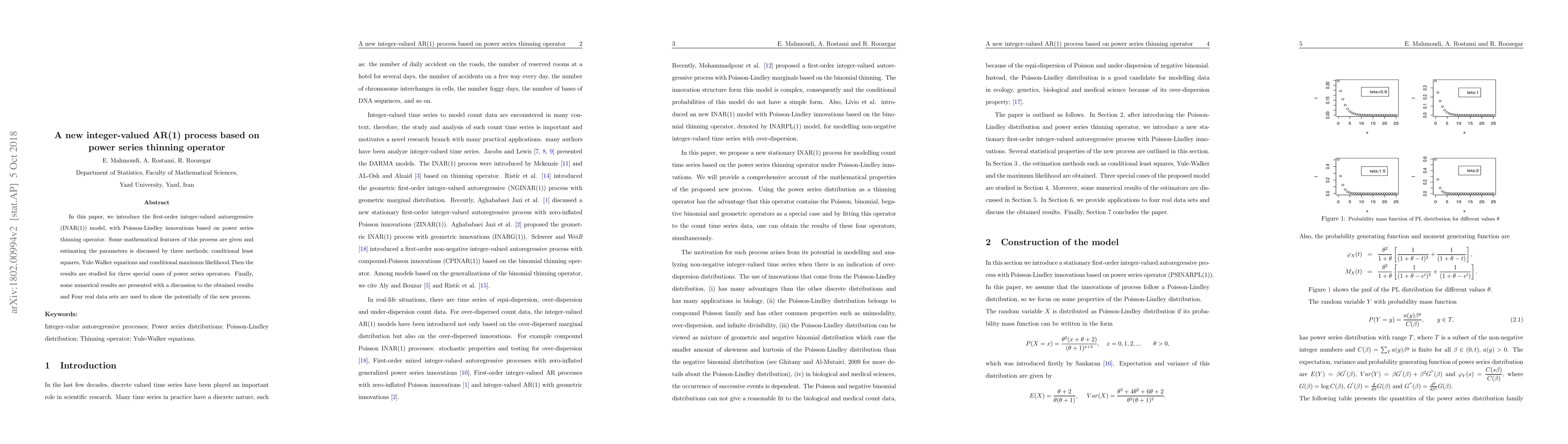This paper introduces a new first-order integer-valued autoregressive (INAR(1)) model using Poisson-Lindley innovations via a power series thinning operator. It discusses parameter estimation methods and examines three special cases, concluding with numerical results and applications to four real datasets to demonstrate the model's potential.