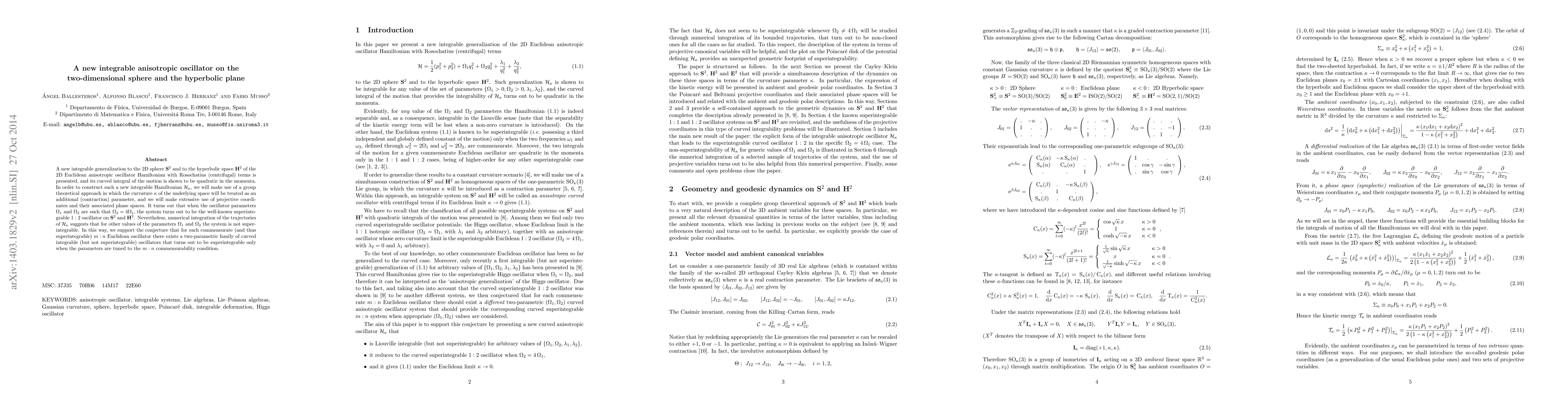 This paper introduces a new integrable anisotropic oscillator on the 2D sphere and hyperbolic plane, generalizing the 2D Euclidean anisotropic oscillator with centrifugal terms. The system is shown to be superintegrable under specific parameter conditions, but not for general values, supporting the conjecture of a family of curved integrable oscillators.