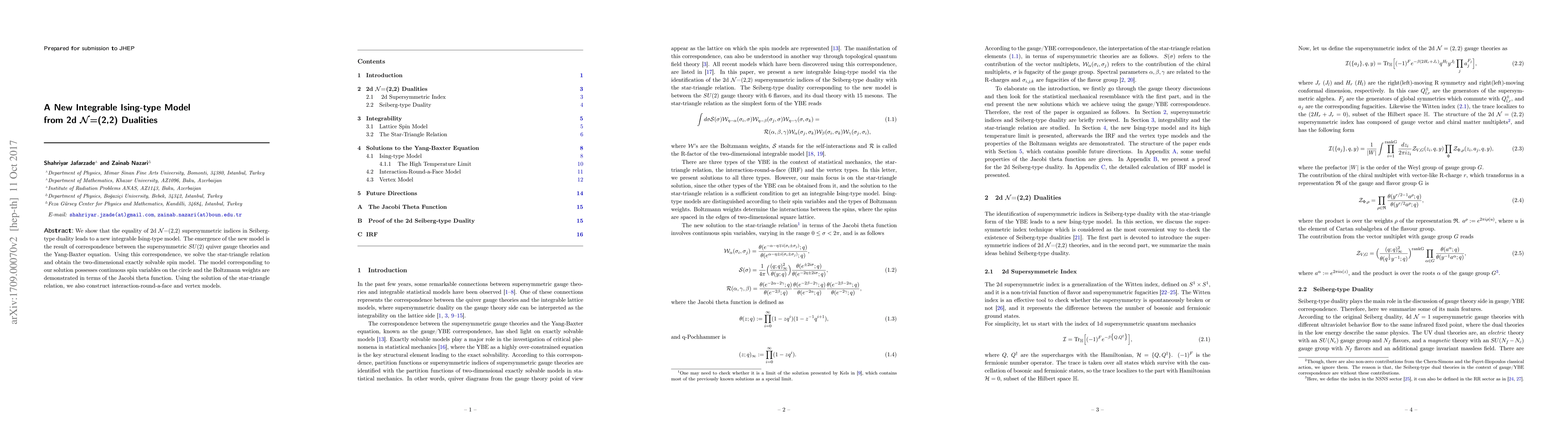 This paper demonstrates how 2d $\mathcal{N}$=(2,2) supersymmetric duality leads to a new integrable Ising-type model, derived from a correspondence between $SU(2)$ quiver gauge theories and the Yang-Baxter equation, with solutions expressed via Jacobi theta functions. The model supports continuous spin variables and includes constructions of interaction-round-a-face and vertex models.