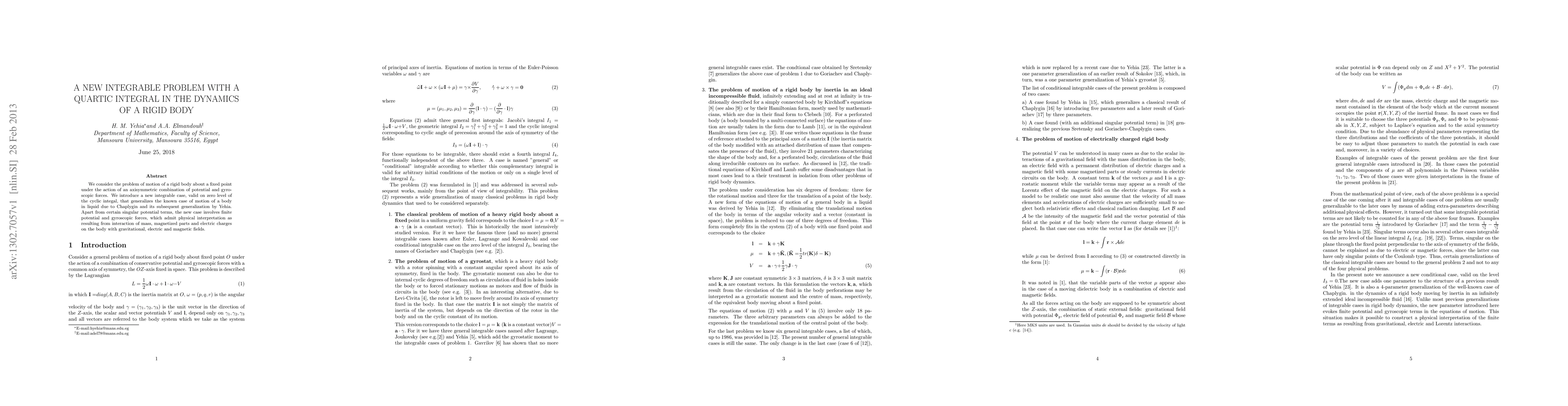 We consider the problem of motion of a rigid body about a fixed point under the action of an axisymmetric combination of potential and gyroscopic forces. We introduce a new integrable case, valid on zero level of the cyclic integral, that generalizes the known case of motion of a body in liquid due to Chaplygin and its subsequent generalization by Yehia. Apart from certain singular potential terms, the new case involves finite potential and gyroscopic forces, which admit physical interpretation as resulting from interaction of mass, magnetized parts and electric charges on the body with gravitational, electric and magnetic fields.