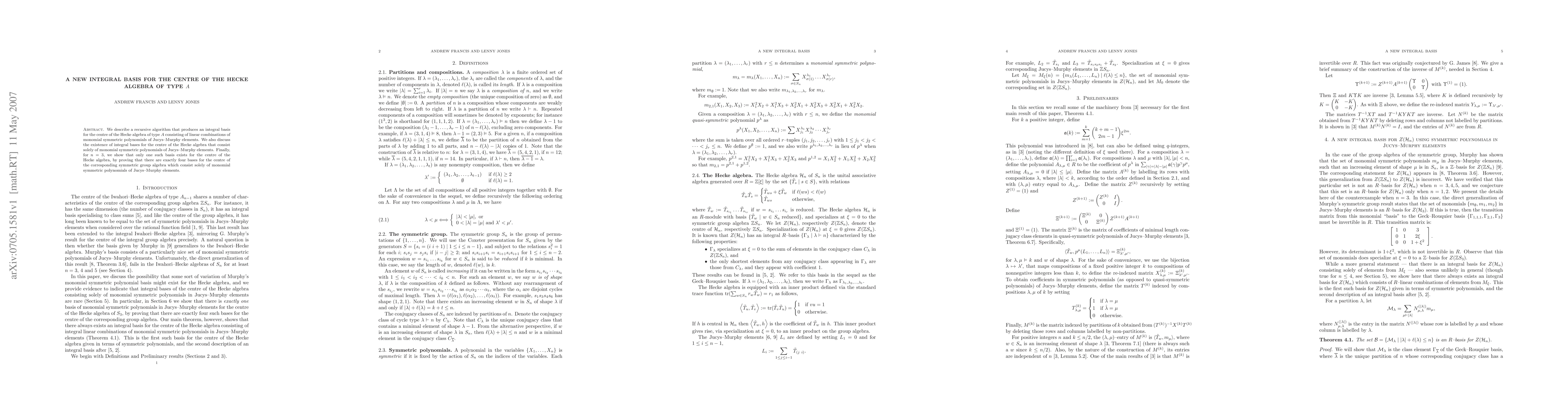 This paper presents a recursive algorithm to generate an integral basis for the centre of the Hecke algebra of type A using linear combinations of monomial symmetric polynomials of Jucys-Murphy elements. It also explores the existence of integral bases consisting solely of these polynomials and specifically proves that for n=3, only one such basis exists.