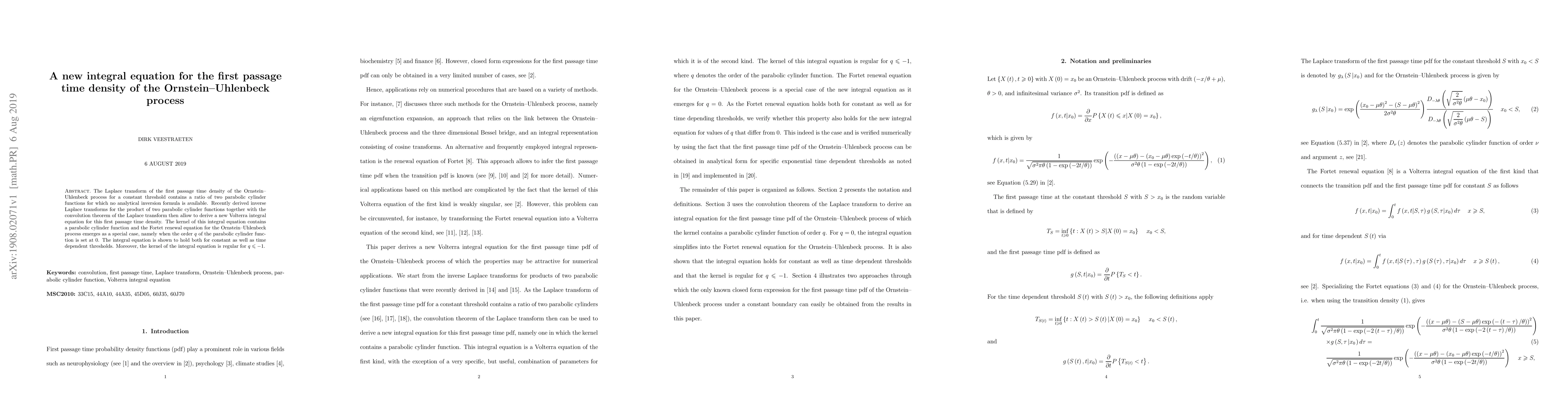 The Laplace transform of the first passage time density of the Ornstein--Uhlenbeck process for a constant threshold contains a ratio of two parabolic cylinder functions for which no analytical inversion formula is available. Recently derived inverse Laplace transforms for the product of two parabolic cylinder functions together with the convolution theorem of the Laplace transform then allow to derive a new Volterra integral equation for this first passage time density. The kernel of this integral equation contains a parabolic cylinder function and the Fortet renewal equation for the Ornstein-Uhlenbeck process emerges as a special case, namely when the order q of the parabolic cylinder function is set at 0. The integral equation is shown to hold both for constant as well as time dependent thresholds. Moreover, the kernel of the integral equation is regular for q<=-1.