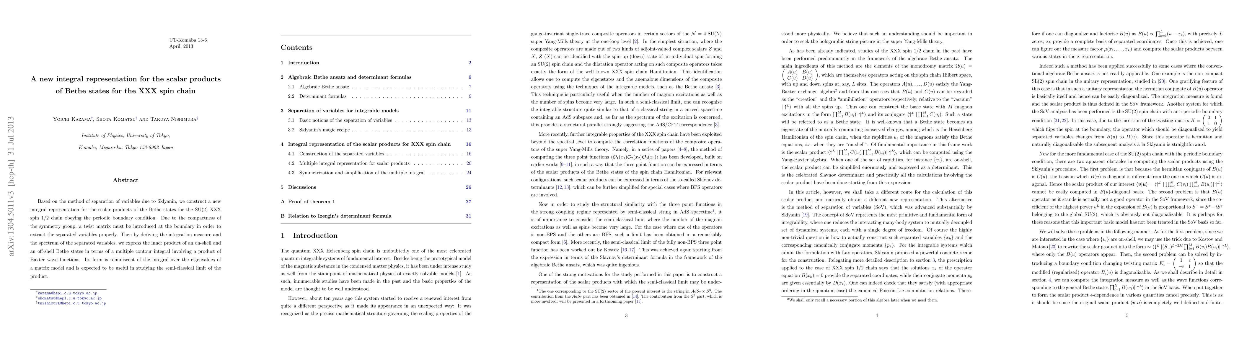 Based on the method of separation of variables due to Sklyanin, we construct a new integral representation for the scalar products of the Bethe states for the SU(2) XXX spin 1/2 chain obeying the periodic boundary condition. Due to the compactness of the symmetry group, a twist matrix must be introduced at the boundary in order to extract the separated variables properly. Then by deriving the integration measure and the spectrum of the separated variables, we express the inner product of an on-shell and an off-shell Bethe states in terms of a multiple contour integral involving a product of Baxter wave functions. Its form is reminiscent of the integral over the eigenvalues of a matrix model and is expected to be useful in studying the semi-classical limit of the product.