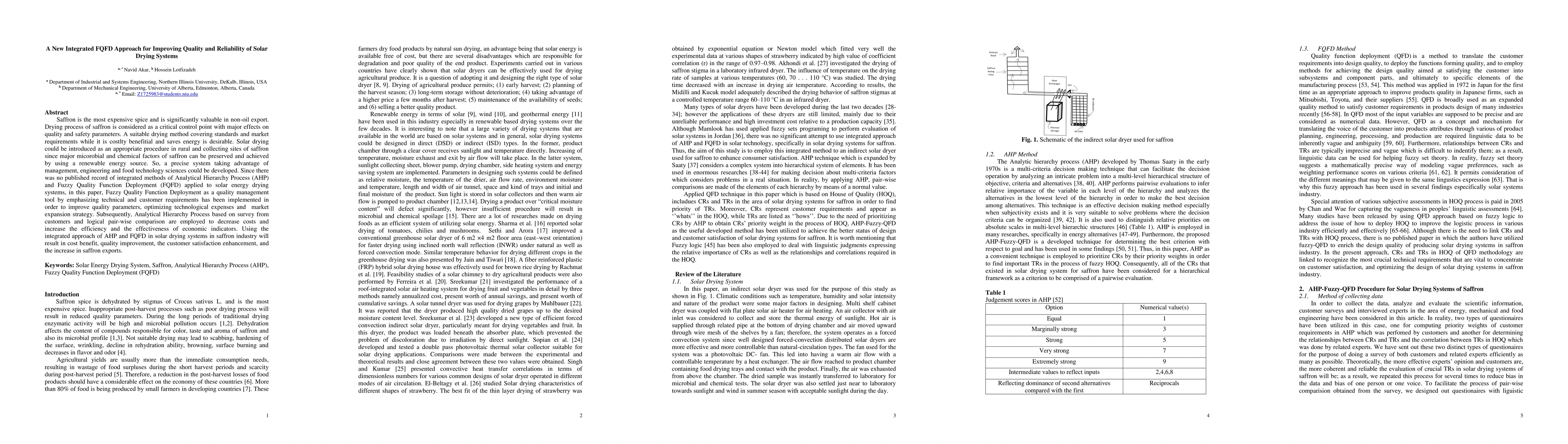 A new integrated approach using Fuzzy Quality Function Deployment (FQFD) and Analytical Hierarchy Process (AHP) is proposed to improve quality and reliability of solar drying systems for saffron, aiming to reduce costs and increase efficiency.