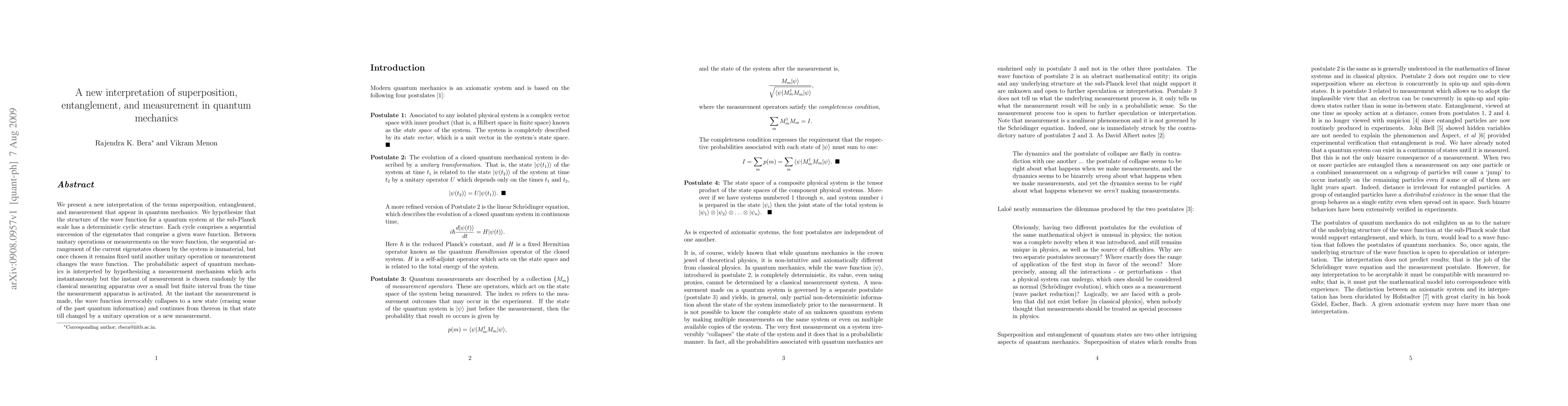 We present a new interpretation of the terms superposition, entanglement, and measurement that appear in quantum mechanics. We hypothesize that the structure of the wave function for a quantum system at the sub-Planck scale has a deterministic cyclic structure. Each cycle comprises a sequential succession of the eigenstates that comprise a given wave function. Between unitary operations or measurements on the wave function, the sequential arrangement of the current eigenstates chosen by the system is immaterial, but once chosen it remains fixed until another unitary operation or measurement changes the wave function. The probabilistic aspect of quantum mechanics is interpreted by hypothesizing a measurement mechanism which acts instantaneously but the instant of measurement is chosen randomly by the classical measuring apparatus over a small but finite interval from the time the measurement apparatus is activated. At the instant the measurement is made, the wave function irrevocably collapses to a new state (erasing some of the past quantum information) and continues from thereon in that state till changed by a unitary operation or a new measurement.