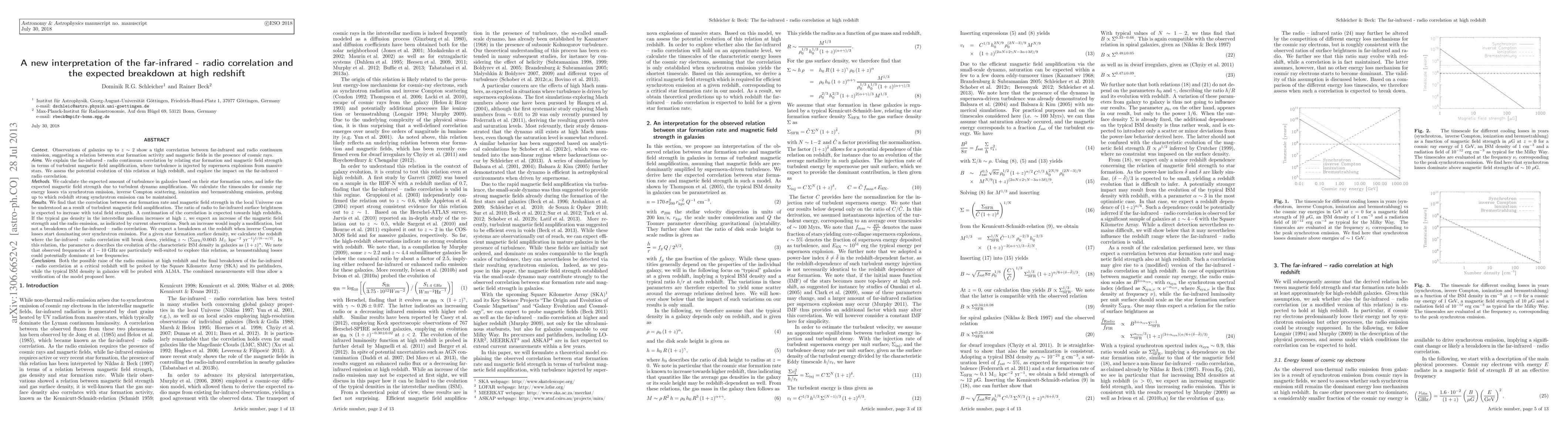 This paper proposes a new interpretation of the far-infrared to radio correlation in galaxies, attributing it to turbulent magnetic field amplification driven by supernova explosions. It predicts a correlation breakdown at high redshift due to inverse Compton losses dominating over synchrotron emission, with the critical redshift dependent on star formation rates and ISM density evolution.