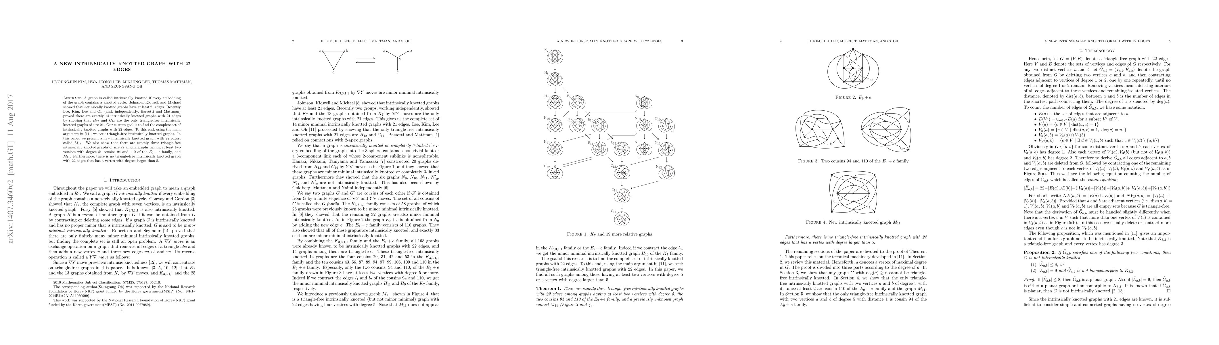 A graph is called intrinsically knotted if every embedding of the graph contains a knotted cycle. Johnson, Kidwell and Michael showed that intrinsically knotted graphs have at least 21 edges. Recently Lee, Kim, Lee and Oh, and, independently, Barsotti and Mattman, showed that $K_7$ and the 13 graphs obtained from $K_7$ by $\nabla Y$ moves are the only intrinsically knotted graphs with 21 edges. In this paper we present the following results: there are exactly three triangle-free intrinsically knotted graphs with 22 edges having at least two vertices of degree 5. Two are the cousins 94 and 110 of the $E_9+e$ family and the third is a previously unknown graph named $M_{11}$. These graphs are shown in Figure 3 and 4. Furthermore, there is no triangle-free intrinsically knotted graph with 22 edges that has a vertex with degree larger than 5.