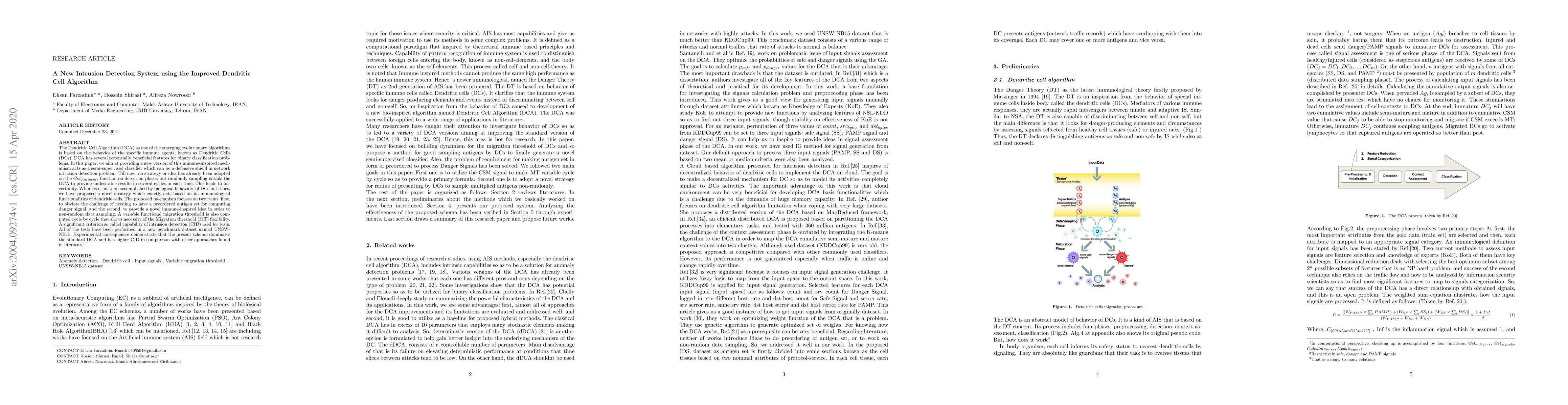 The Dendritic Cell Algorithm (DCA) as one of the emerging evolutionary algorithms is based on the behavior of the specific immune agents; known as Dendritic Cells (DCs). DCA has several potentially beneficial features for binary classification problems. In this paper, we aim at providing a new version of this immune-inspired mechanism acts as a semi-supervised classifier which can be a defensive shield in network intrusion detection problem. Till now, no strategy or idea has already been adopted on the GetAntigen() function on detection phase, but randomly sampling entails the DCA to provide undesirable results in several cycles in each time. This leads to uncertainty. Whereas it must be accomplished by biological behaviors of DCs in tissues, we have proposed a novel strategy which exactly acts based on its immunological functionalities of dendritic cells. The proposed mechanism focuses on two items: First, to obviate the challenge of needing to have a preordered antigen set for computing danger signal, and the second, to provide a novel immune-inspired idea in order to non-random data sampling. A variable functional migration threshold is also computed cycle by cycle that shows necessity of the Migration threshold (MT) flexibility. A significant criterion so called capability of intrusion detection (CID) used for tests. All of the tests have been performed in a new benchmark dataset named UNSW-NB15. Experimental consequences demonstrate that the present schema dominates the standard DCA and has higher CID in comparison with other approaches found in literature.