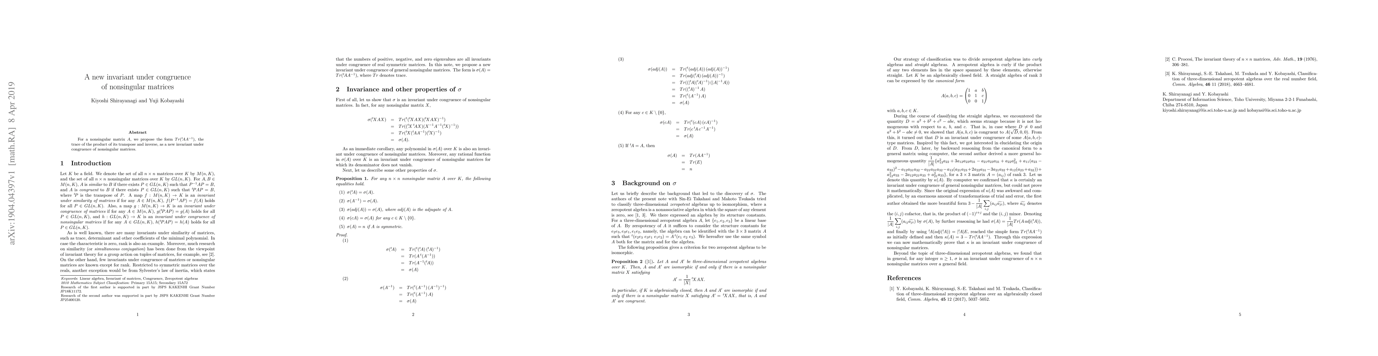 Summary: This paper introduces a new invariant under congruence for nonsingular matrices, defined as the trace of the product of the transpose and inverse of the matrix, denoted as $Tr(^t\!A A^{-1})$. This invariant remains unchanged under congruence transformations.
