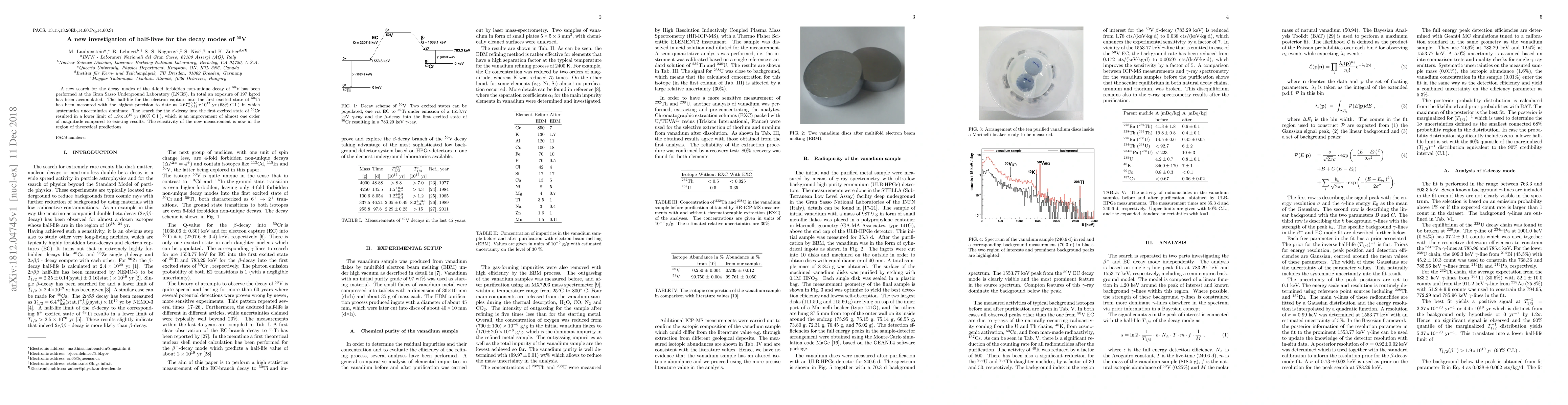 A new search for the decay modes of the 4-fold forbidden non-unique decay of $^{50}$V has been performed at the Gran Sasso Underground Laboratory (LNGS). In total an exposure of 197 kg $\times$ d has been accumulated. The half-life for the electron capture into the first excited state of $^{50}$Ti has been measured with the highest precision to date as $2.67_{-0.18}^{+0.16} \times 10^{17}$ yr (68% C.I.) in which systematics uncertainties dominate. The search for the $\beta$-decay into the first excited state of $^{50}$Cr resulted in a lower limit of ${1.9} \times 10^{19}$ yr (90% C.I.), which is an improvement of almost one order of magnitude compared to existing results. The sensitivity of the new measurement is now in the region of theoretical predictions.