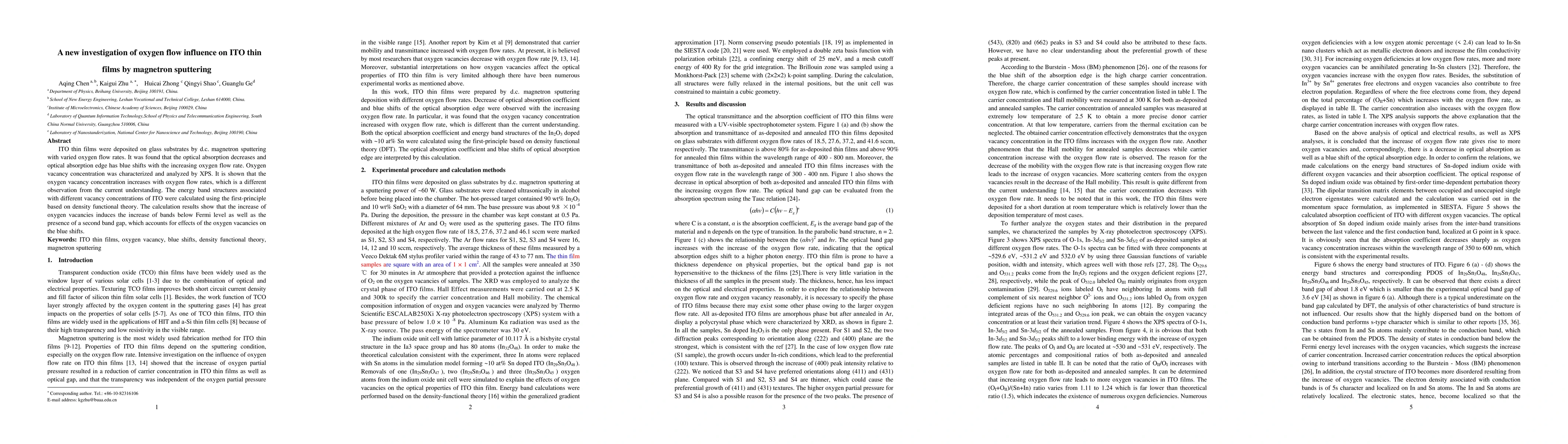 ITO thin films were deposited on glass substrates by d.c. magnetron sputtering with varied oxygen flow rates. It was found that the optical absorption decreases and optical absorption edge has blue shifts with the increasing oxygen flow rate. Oxygen vacancy concentration was characterized and analyzed by XPS. It is shown that the oxygen vacancy concentration increases with oxygen flow rates, which is a different observation from the current understanding. The energy band structures associated with different vacancy concentrations of ITO were calculated using the first-principle based on density functional theory. The calculation results show that the increase of oxygen vacancies induces the increase of bands below Fermi level as well as the presence of a second band gap, which accounts for effects of the oxygen vacancies on the blue shifts.