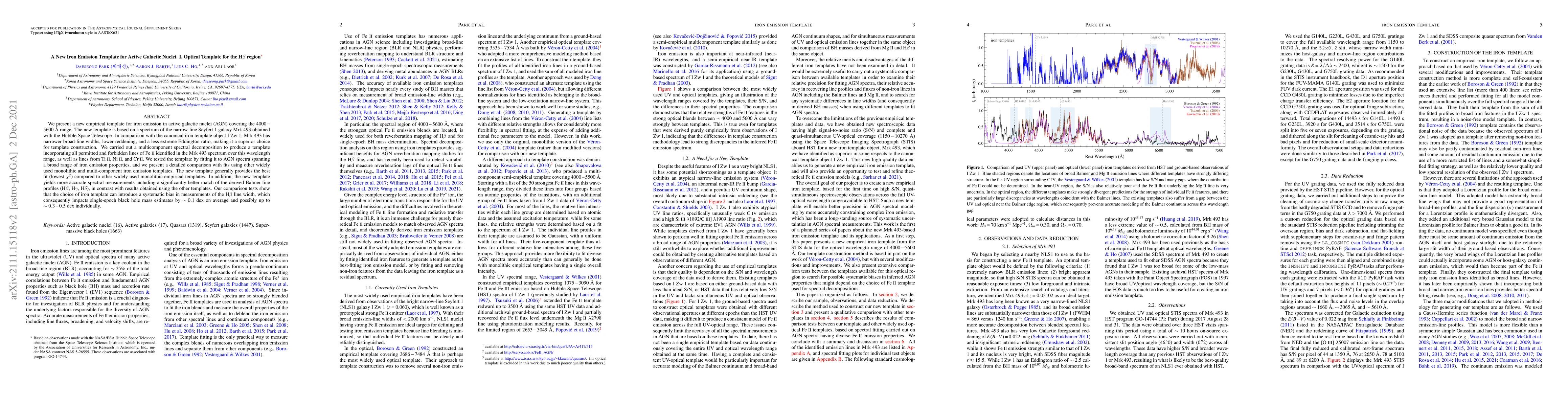 We present a new empirical template for iron emission in active galactic nuclei (AGN) covering the $4000-5600$ A range. The new template is based on a spectrum of the narrow-line Seyfert 1 galaxy Mrk 493 obtained with the Hubble Space Telescope. In comparison with the canonical iron template object I Zw 1, Mrk 493 has narrower broad-line widths, lower reddening, and a less extreme Eddington ratio, making it a superior choice for template construction. We carried out a multicomponent spectral decomposition to produce a template incorporating all permitted and forbidden lines of Fe II identified in the Mrk 493 spectrum over this wavelength range, as well as lines from Ti II, Ni II, and Cr II. We tested the template by fitting it to AGN spectra spanning a broad range of iron emission properties, and we present a detailed comparison with fits using other widely used monolithic and multi-component iron emission templates. The new template generally provides the best fit (lowest $\chi^2$) compared to other widely used monolithic empirical templates. In addition, the new template yields more accurate spectral measurements including a significantly better match of the derived Balmer line profiles (H$\beta$, H$\gamma$, H$\delta$), in contrast with results obtained using the other templates. Our comparison tests show that the choice of iron template can introduce a systematic bias in measurements of the H$\beta$ line width, which consequently impacts single-epoch black hole mass estimates by $\sim0.1$ dex on average and possibly up to $\sim0.3-0.5$ dex individually.