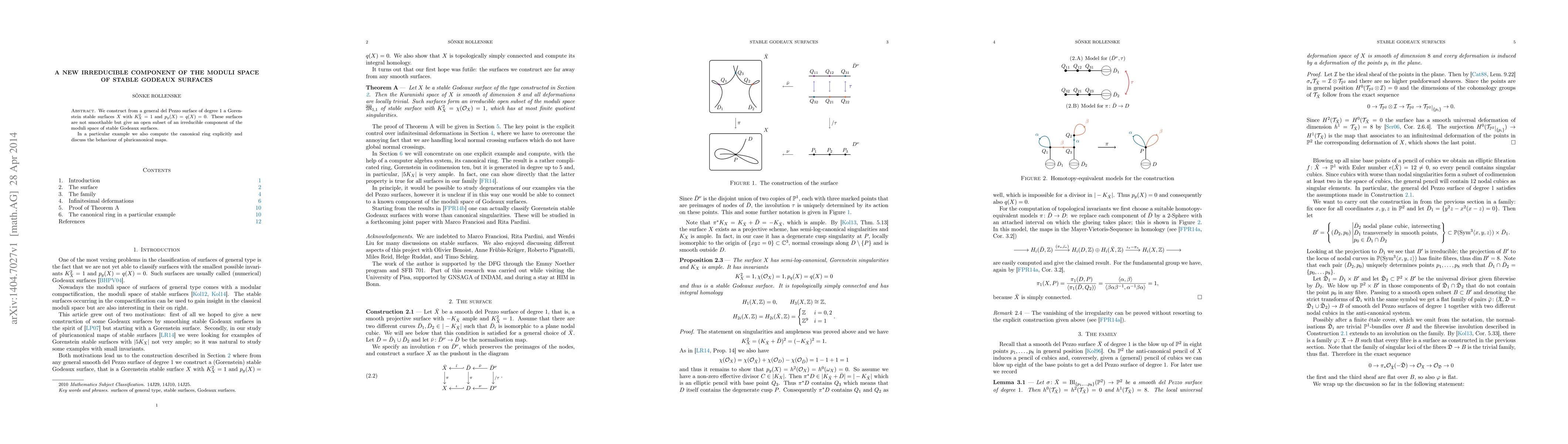This paper constructs a new irreducible component of the moduli space of stable Godeaux surfaces from a general del Pezzo surface of degree 1, featuring surfaces $X$ with $K_X^2=1$ and $p_g(X)=q(X)=0$. It also computes the canonical ring explicitly for a particular example and discusses the behavior of pluricanonical maps.