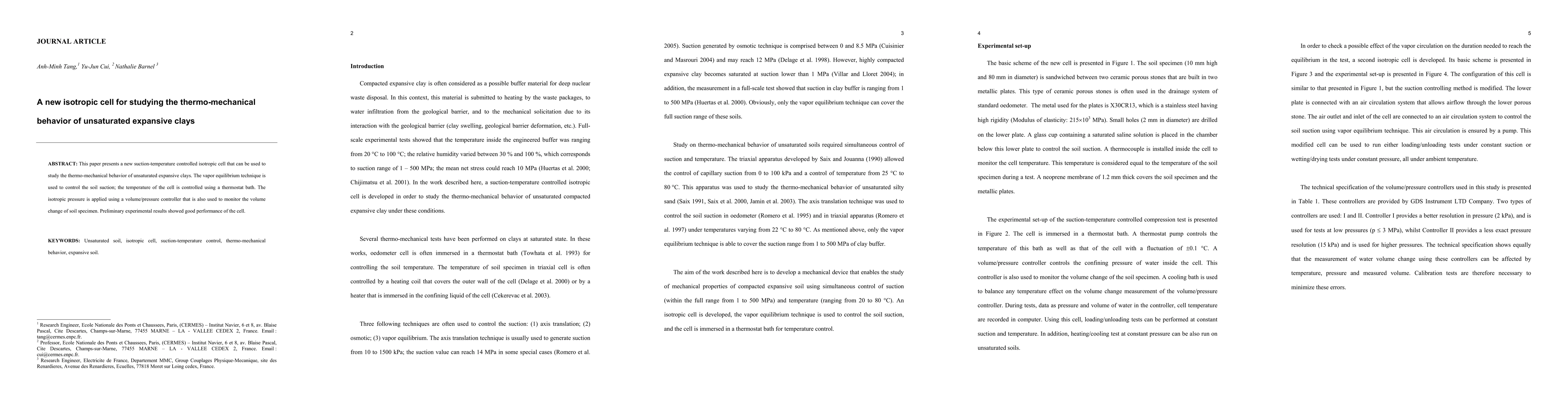 This paper presents a new suction-temperature controlled isotropic cell that can be used to study the thermo-mechanical behavior of unsaturated expansive clays. The vapor equilibrium technique is used to control the soil suction; the temperature of the cell is controlled using a thermostat bath. The isotropic pressure is applied using a volume/pressure controller that is also used to monitor the volume change of soil specimen. Preliminary experimental results showed good performance of the cell.