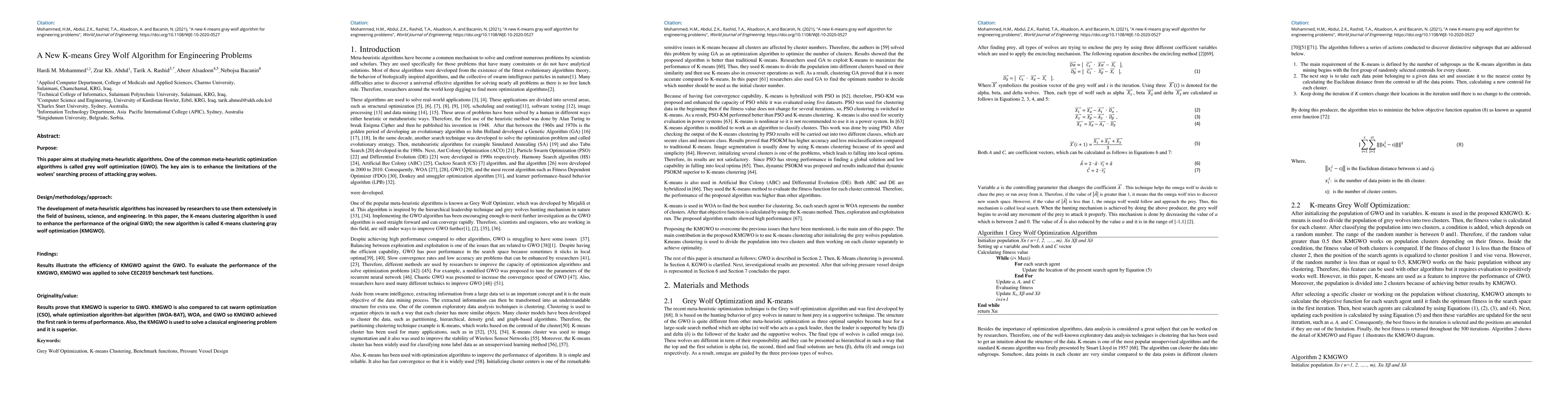 This paper proposes a K-means Grey Wolf Optimization (KMGWO) algorithm to enhance the Grey Wolf Optimization by using K-means clustering to avoid local optima. The KMGWO outperforms the original GWO and other algorithms like CSO, WOA-BAT, and WOA in benchmark tests and a pressure vessel design problem, demonstrating superior performance.