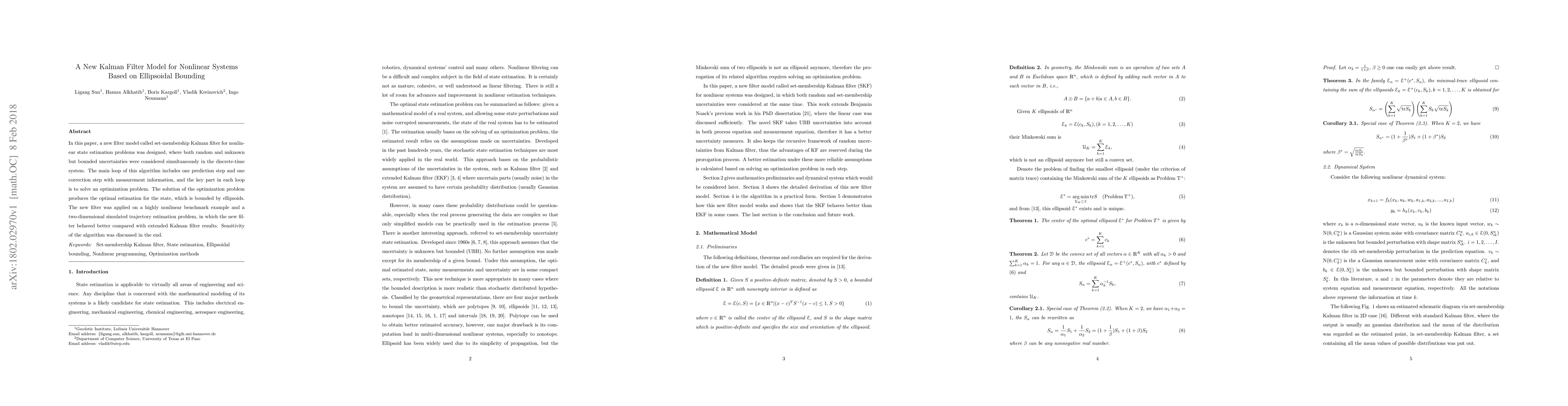 In this paper, a new filter model called set-membership Kalman filter for nonlinear state estimation problems was designed, where both random and unknown but bounded uncertainties were considered simultaneously in the discrete-time system. The main loop of this algorithm includes one prediction step and one correction step with measurement information, and the key part in each loop is to solve an optimization problem. The solution of the optimization problem produces the optimal estimation for the state, which is bounded by ellipsoids. The new filter was applied on a highly nonlinear benchmark example and a two-dimensional simulated trajectory estimation problem, in which the new filter behaved better compared with extended Kalman filter results. Sensitivity of the algorithm was discussed in the end.
