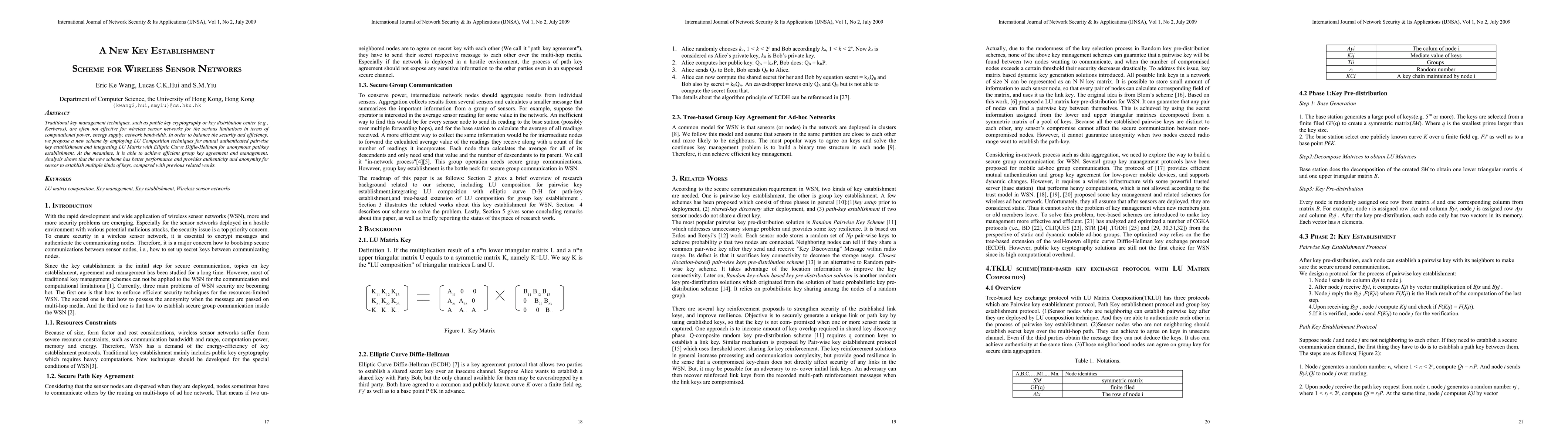 This paper proposes a new key establishment scheme for wireless sensor networks using LU Composition techniques and Elliptic Curve Diffie-Hellman for mutual authentication and anonymous pathkey establishment, achieving better performance and efficiency while balancing security and resource constraints compared to traditional methods.
