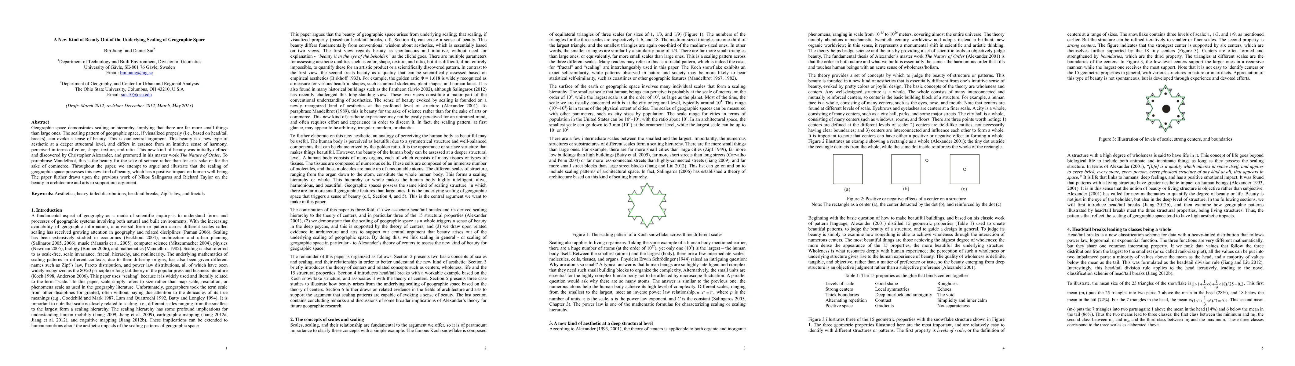 Geographic space demonstrates scaling or hierarchy, implying that there are far more small things than large ones. The scaling pattern of geographic space, if visualized properly (i.e., based on head/tail breaks), can evoke a sense of beauty. This is our central argument. This beauty is a new type of aesthetic at a deeper structural level, and differs in essence from an intuitive sense of harmony, perceived in terms of color, shape, texture, and ratio. This new kind of beauty was initially defined and discovered by Christopher Alexander, and promoted in his master work The Nature of Order. To paraphrase Mandelbrot, this is the beauty for the sake of science rather than for art's sake or for the sake of commerce. Throughout the paper, we attempt to argue and illustrate that the scaling of geographic space possesses this new kind of beauty, which has a positive impact on human well-being. The paper further draws upon the previous work of Nikos Salingaros and Richard Taylor on the beauty in architecture and arts to support our argument. Keywords: Aesthetics, heavy-tailed distributions, head/tail breaks, Zipf's law, and fractals