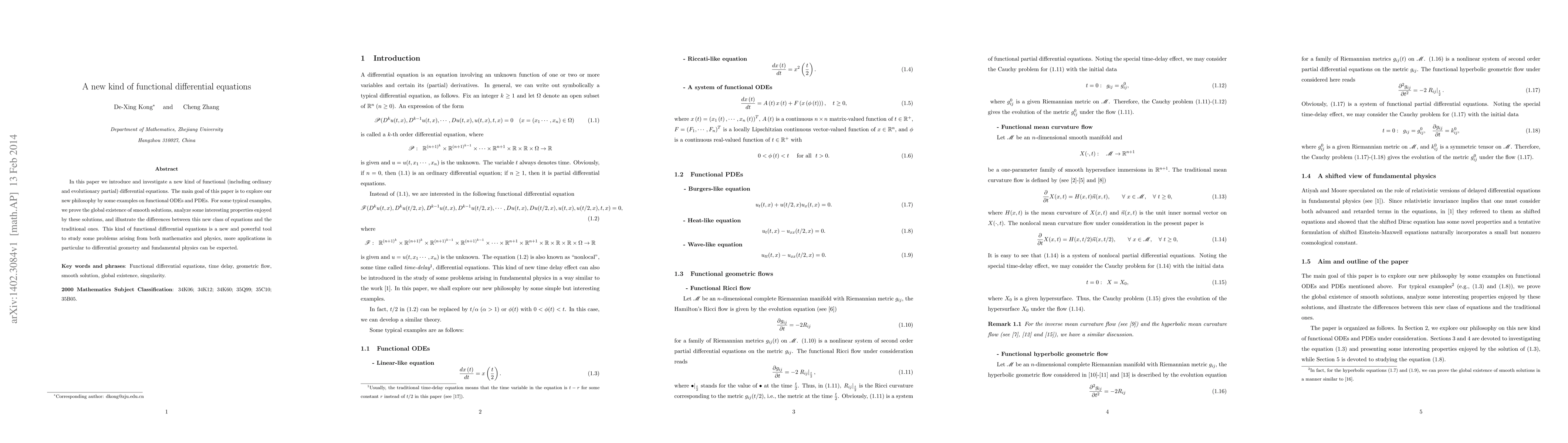 This paper explores a novel type of functional differential equations, including both ordinary and partial forms, and demonstrates their global existence and unique properties through examples. The new class of equations offers a powerful tool for addressing problems in mathematics and physics, with potential applications in differential geometry and fundamental physics.