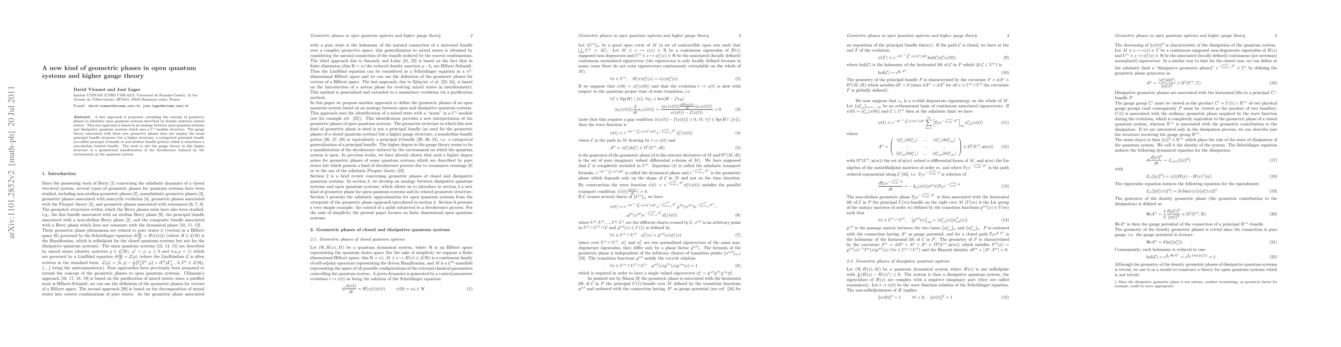 A new approach extending the concept of geometric phases to adiabatic open quantum systems described by density matrices (mixed states) is proposed. This new approach is based on an analogy between open quantum systems and dissipative quantum systems which uses a $C^*$-module structure. The gauge theory associated with these new geometric phases does not take place in an usual principal bundle structure but in an higher structure, a categorical principal bundle (so-called principal 2-bundle or non-abelian bundle gerbes) which is sometimes a non-abelian twisted bundle. This higher degree in the gauge theory is a geometrical manifestation of the decoherence induced by the environment on the quantum system.