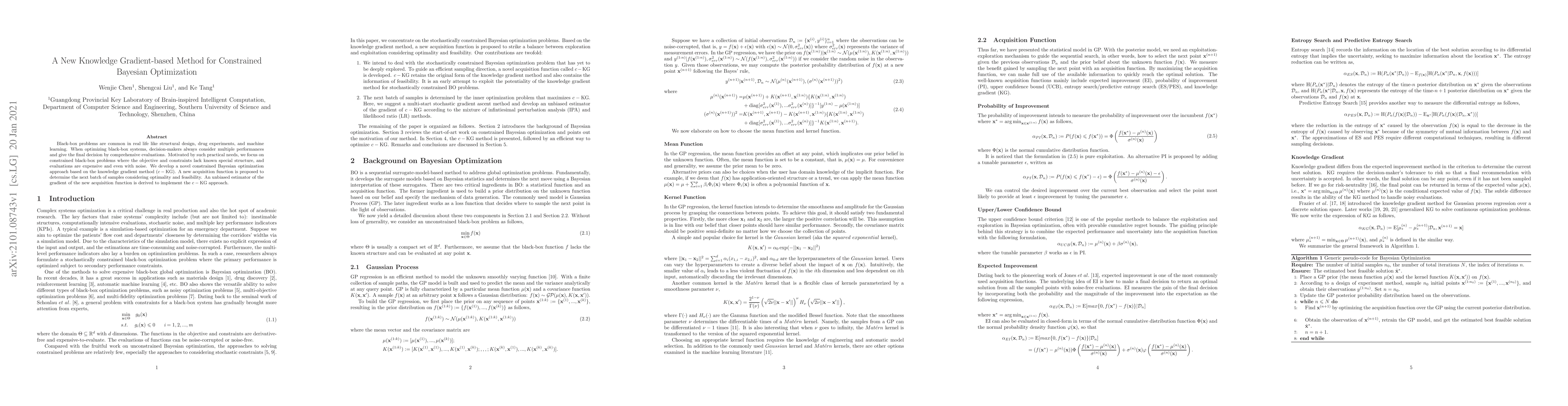 Black-box problems are common in real life like structural design, drug experiments, and machine learning. When optimizing black-box systems, decision-makers always consider multiple performances and give the final decision by comprehensive evaluations. Motivated by such practical needs, we focus on constrained black-box problems where the objective and constraints lack known special structure, and evaluations are expensive and even with noise. We develop a novel constrained Bayesian optimization approach based on the knowledge gradient method ($c-\rm{KG}$). A new acquisition function is proposed to determine the next batch of samples considering optimality and feasibility. An unbiased estimator of the gradient of the new acquisition function is derived to implement the $c-\rm{KG}$ approach.