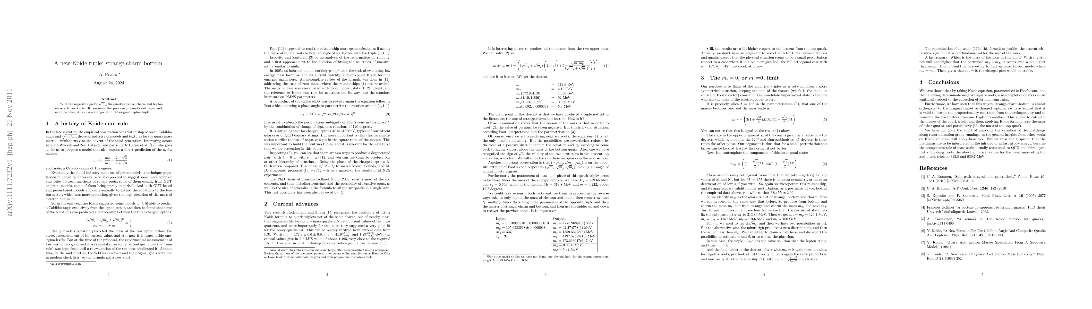 With the negative sign for $\sqrt m_s$, the quarks strange, charm and bottom make a Koide tuple. It continues the c-b-t tuple previously found by Rodejohann and Zhang and, more peculiar, it is quasi-orthogonal to the original lepton triplet.