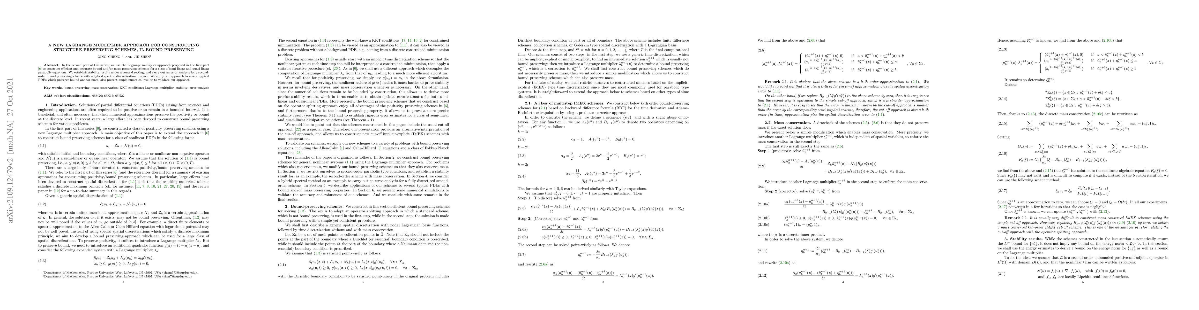 This paper extends the Lagrange multiplier approach to develop efficient schemes that preserve bounds and mass for semi-linear and quasi-linear parabolic equations. It provides stability results and error analysis for a second-order scheme, and validates the method through numerical experiments on various PDEs.