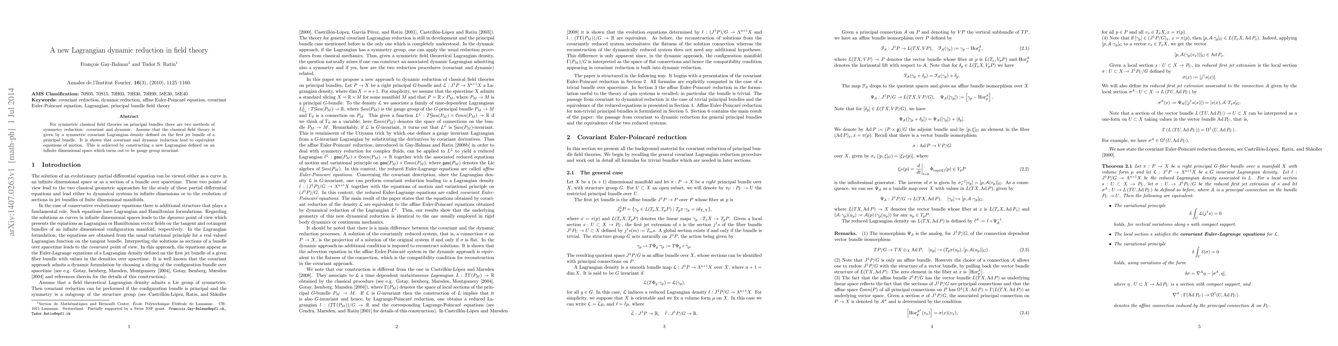 This paper presents a new Lagrangian dynamic reduction method for symmetric classical field theories on principal bundles, demonstrating that both covariant and dynamic reductions yield equivalent equations of motion through a gauge group invariant Lagrangian defined on an infinite-dimensional space.