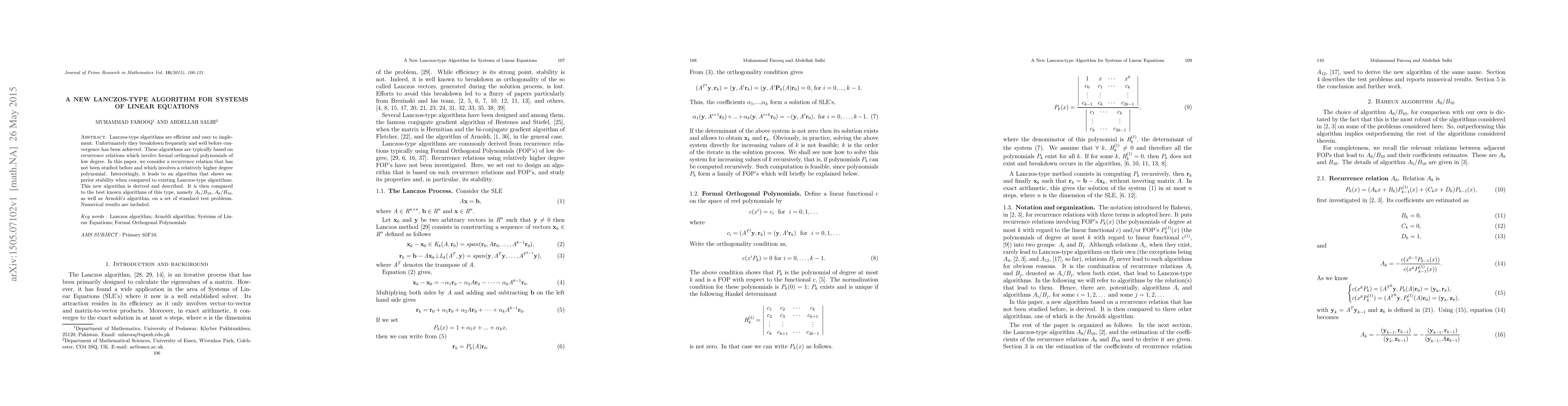 Lanczos-type algorithms are efficient and easy to implement. Unfortunately they breakdown frequently and well before convergence has been achieved. These algorithms are typically based on recurrence relations which involve formal orthogonal polynomials of low degree. In this paper, we consider a recurrence relation that has not been studied before and which involves a relatively higher degree polynomial. Interestingly, it leads to an algorithm that shows superior stability when compared to existing Lanczos-type algorithms. This new algorithm is derived and described. It is then compared to the best known algorithms of this type, namely A5/B10, A8/B10, as well as Arnoldi's algorithm, on a set of standard test problems. Numerical results are included.