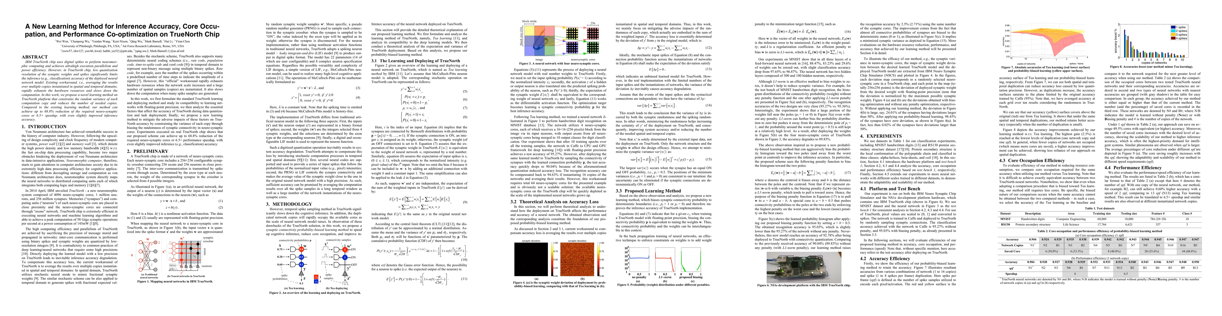 This paper proposes a new learning method to enhance inference accuracy and optimize performance on the IBM TrueNorth chip, addressing the limitations of low quantization resolution. The method reduces the number of required neuro-synaptic cores by 68.8% and achieves a 6.5X speedup while slightly improving inference accuracy.