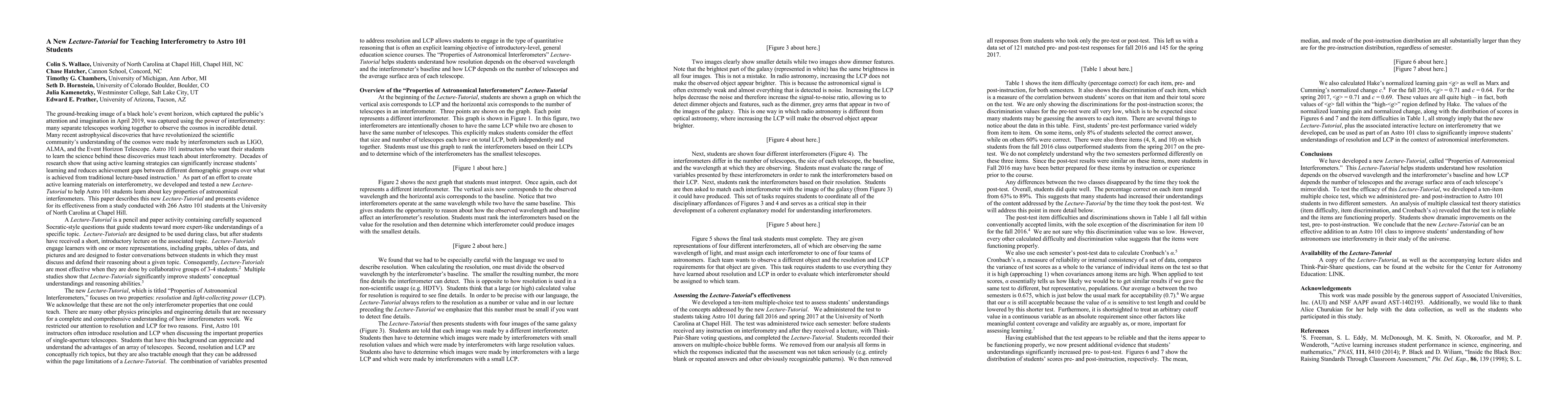 The ground-breaking image of a black hole's event horizon, which captured the public's attention and imagination in April 2019, was captured using the power of interferometry: many separate telescopes working together to observe the cosmos in incredible detail. Many recent astrophysical discoveries that have revolutionized the scientific community's understanding of the cosmos were made by interferometers such as LIGO, ALMA, and the Event Horizon Telescope. Astro 101 instructors who want their students to learn the science behind these discoveries must teach about interferometry. Decades of research show that using active learning strategies can significantly increase students' learning and reduces achievement gaps between different demographic groups over what is achieved from traditional lecture-based instruction. As part of an effort to create active learning materials on interferometry, we developed and tested a new Lecture-Tutorial to help Astro 101 students learn about key properties of astronomical interferometers. This paper describes this new Lecture-Tutorial and presents evidence for its effectiveness from a study conducted with 266 Astro 101 students at the University of North Carolina at Chapel Hill.