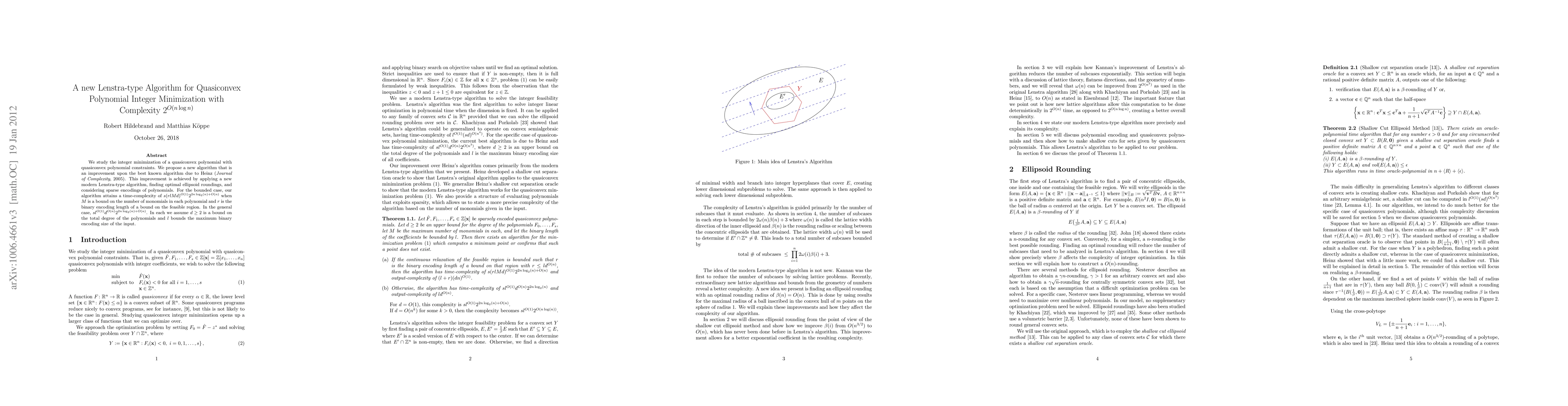 This paper introduces a new Lenstra-type algorithm for minimizing quasiconvex polynomial integers with quasiconvex constraints, improving upon Heinz's 2005 algorithm. The proposed method achieves a time complexity of 2^O(n log n) through optimal ellipsoid roundings and sparse polynomial encodings.