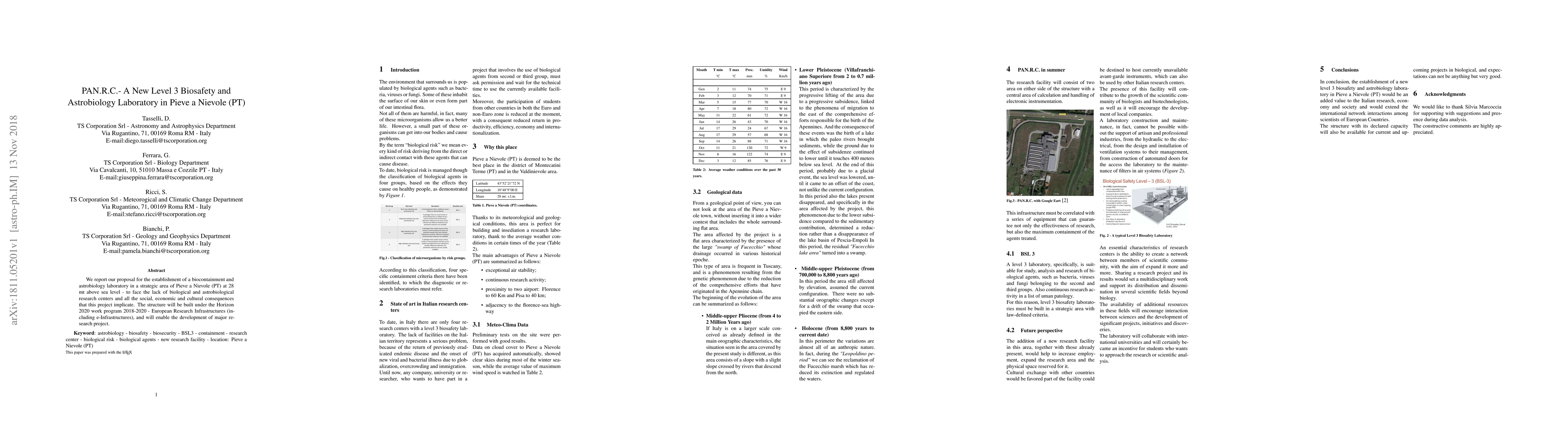 We report our proposal for the establishment of a biocontainment and astrobiology laboratory in a strategic area of Pieve a Nievole (PT) at 28 mt above sea level - to face the lack of biological and astrobiological research centers and all the social, economic and cultural consequences that this project implicate. The structure will be built under the Horizon 2020 work program 2018-2020 - European Research Infrastructures (including e-Infrastructures), and will enable the development of major research project.
