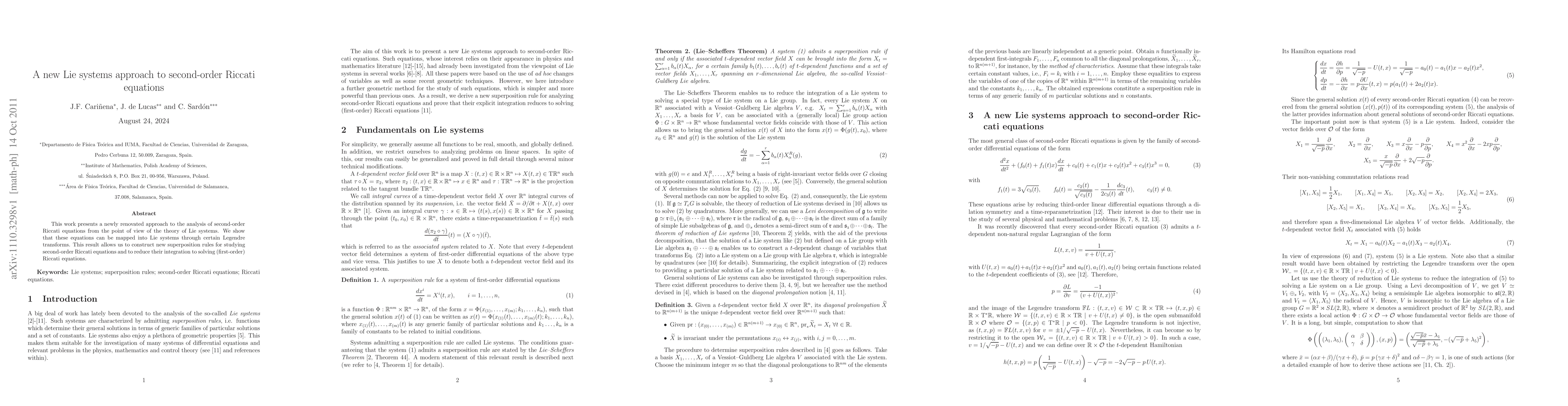 This paper introduces a novel Lie systems approach to analyze second-order Riccati equations, mapping them into Lie systems via Legendre transforms. This method facilitates the construction of new superposition rules and simplifies their integration by reducing them to first-order Riccati equations.