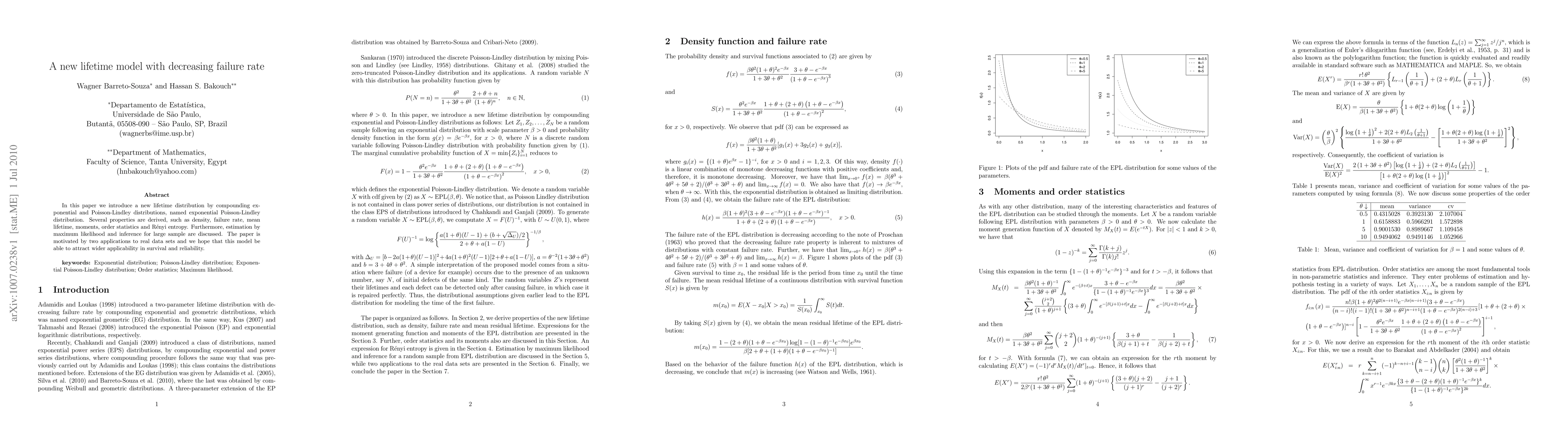 A new lifetime distribution called the exponential Poisson-Lindley distribution is introduced, combining elements of exponential and Poisson-Lindley distributions to model decreasing failure rates. The paper explores its properties, estimation methods, and potential applications in survival and reliability analysis.