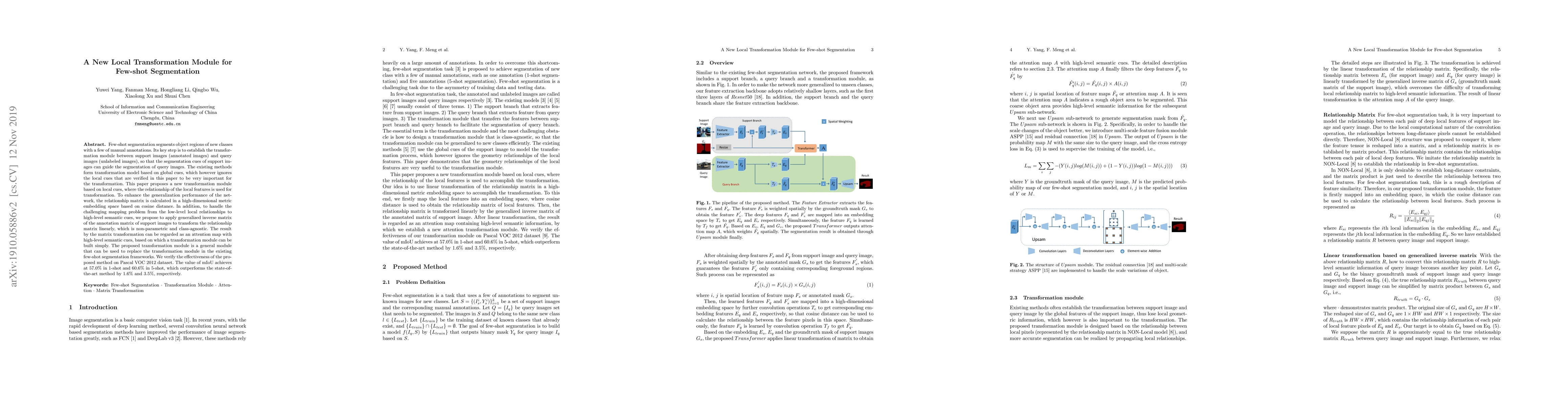 Few-shot segmentation segments object regions of new classes with a few of manual annotations. Its key step is to establish the transformation module between support images (annotated images) and query images (unlabeled images), so that the segmentation cues of support images can guide the segmentation of query images. The existing methods form transformation model based on global cues, which however ignores the local cues that are verified in this paper to be very important for the transformation. This paper proposes a new transformation module based on local cues, where the relationship of the local features is used for transformation. To enhance the generalization performance of the network, the relationship matrix is calculated in a high-dimensional metric embedding space based on cosine distance. In addition, to handle the challenging mapping problem from the low-level local relationships to high-level semantic cues, we propose to apply generalized inverse matrix of the annotation matrix of support images to transform the relationship matrix linearly, which is non-parametric and class-agnostic. The result by the matrix transformation can be regarded as an attention map with high-level semantic cues, based on which a transformation module can be built simply.The proposed transformation module is a general module that can be used to replace the transformation module in the existing few-shot segmentation frameworks. We verify the effectiveness of the proposed method on Pascal VOC 2012 dataset. The value of mIoU achieves at 57.0% in 1-shot and 60.6% in 5-shot, which outperforms the state-of-the-art method by 1.6% and 3.5%, respectively.