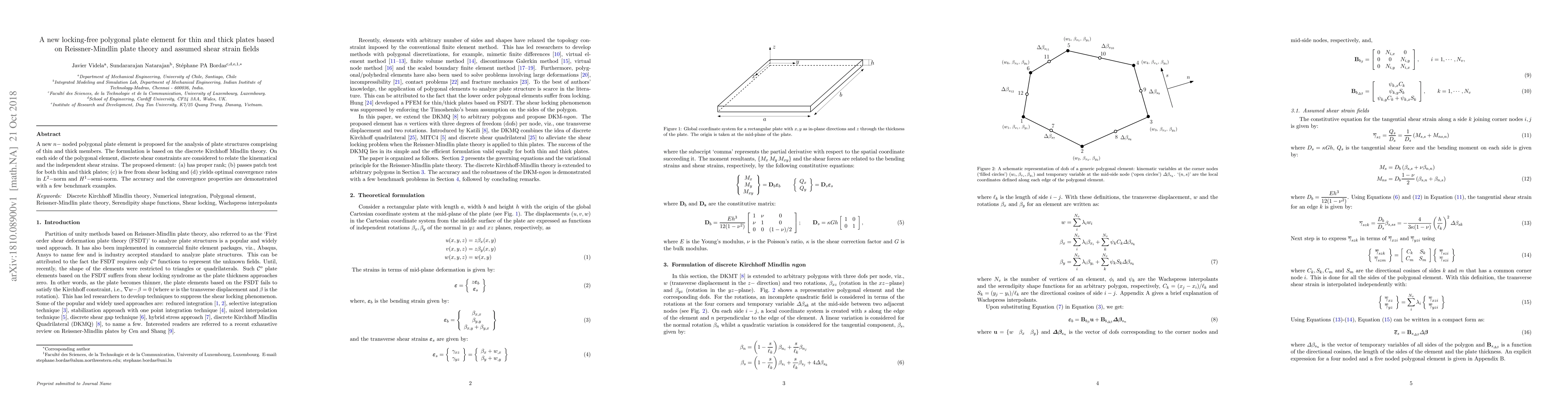 A new $n-$ noded polygonal plate element is proposed for the analysis of plate structures comprising of thin and thick members. The formulation is based on the discrete Kirchhoff Mindlin theory. On each side of the polygonal element, discrete shear constraints are considered to relate the kinematical and the independent shear strains. The proposed element: (a) has proper rank; (b) passes patch test for both thin and thick plates; (c) is free from shear locking and (d) yields optimal convergence rates in $L^2-$norm and $H^1-$semi-norm. The accuracy and the convergence properties are demonstrated with a few benchmark examples.