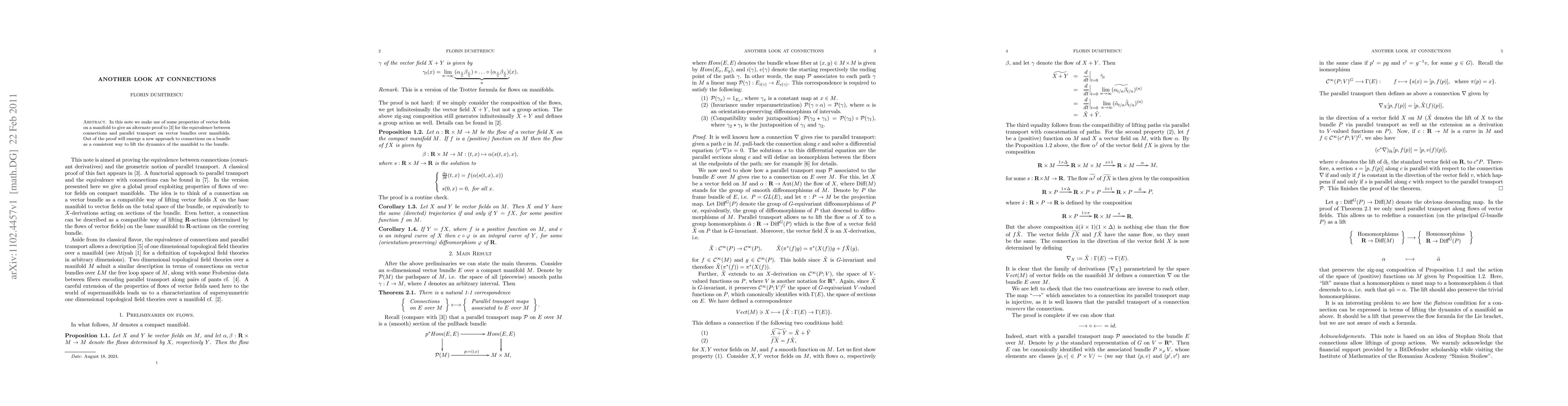 This paper presents an alternative proof for the equivalence between connections and parallel transport on vector bundles over manifolds, utilizing vector field properties. It introduces a novel approach to viewing connections as a consistent method to elevate manifold dynamics to vector bundles.