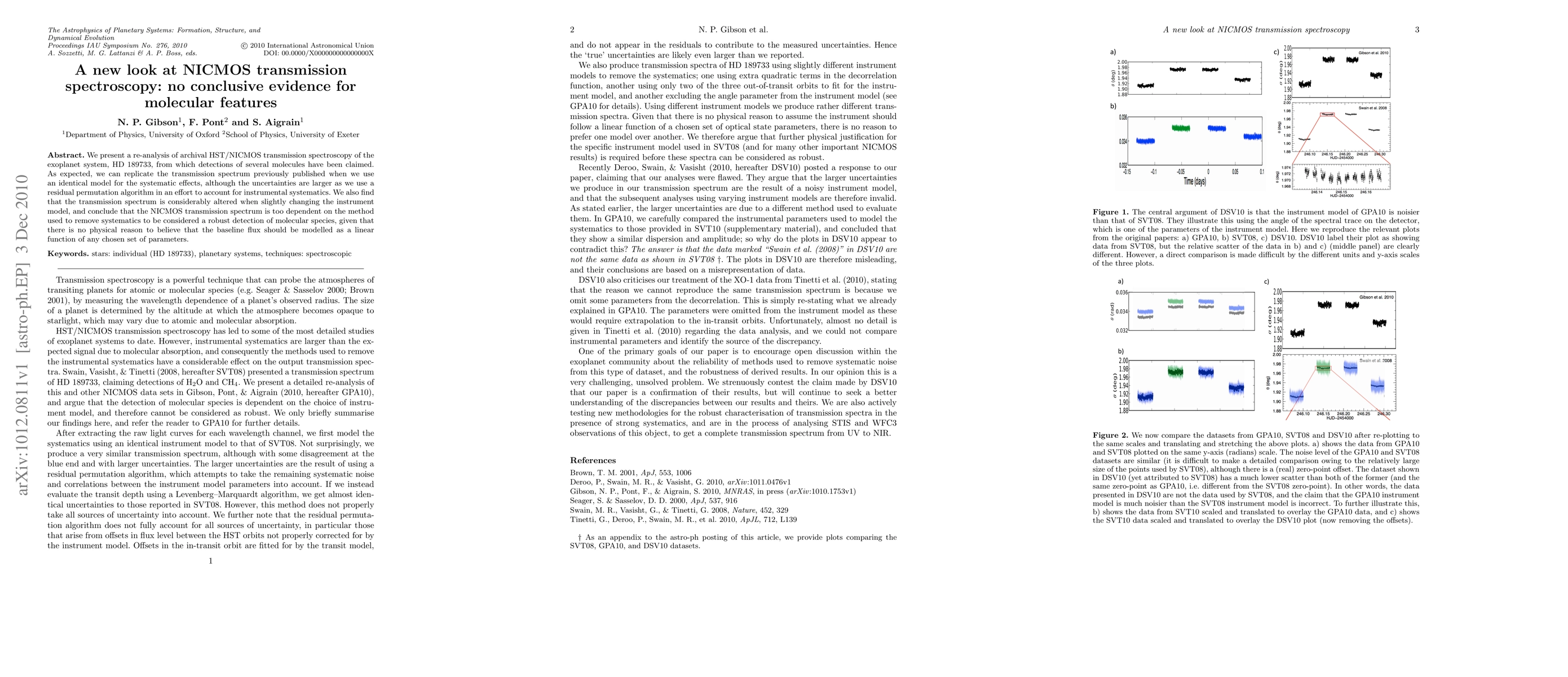 We present a re-analysis of archival HST/NICMOS transmission spectroscopy of the exoplanet system, HD 189733, from which detections of several molecules have been claimed. As expected, we can replicate the transmission spectrum previously published when we use an identical model for the systematic effects, although the uncertainties are larger as we use a residual permutation algorithm in an effort to account for instrumental systematics. We also find that the transmission spectrum is considerably altered when slightly changing the instrument model, and conclude that the NICMOS transmission spectrum is too dependent on the method used to remove systematics to be considered a robust detection of molecular species, given that there is no physical reason to believe that the baseline flux should be modelled as a linear function of any chosen set of parameters.