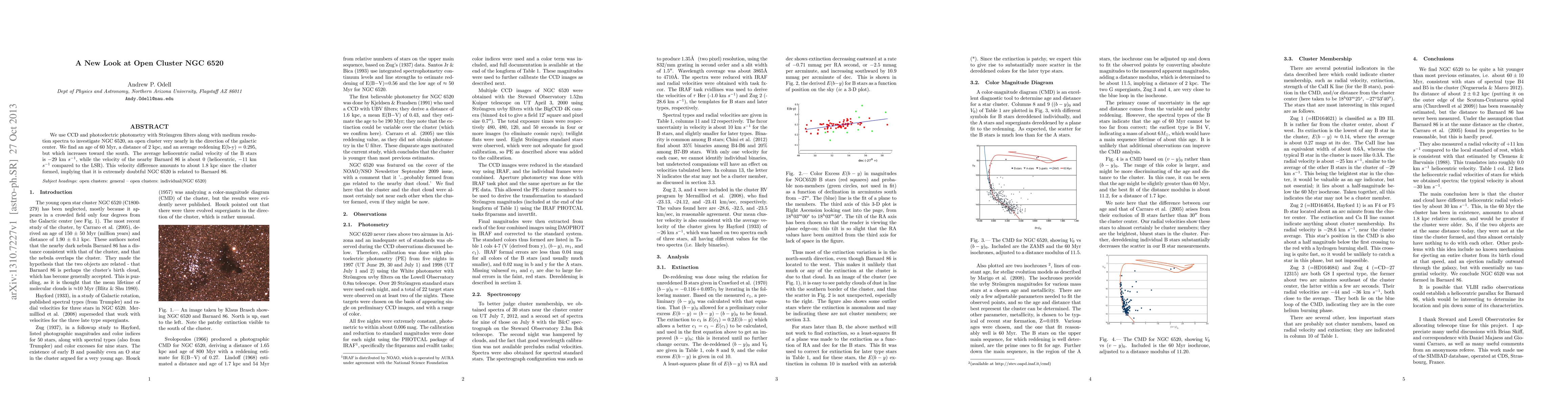 The study of open cluster NGC 6520, close to the galactic center, was conducted using CCD and photoelectric photometry with Stromgren filters and medium resolution spectra. The research determined the cluster's age to be 60 million years, its distance at 2 kiloparsecs, and average reddening E(b-y) = 0.295, rising towards the south. The average heliocentric radial velocity of B stars is -29 km/sec, significantly different from nearby Barnard 86, suggesting NGC 6520 is unlikely related to it.
