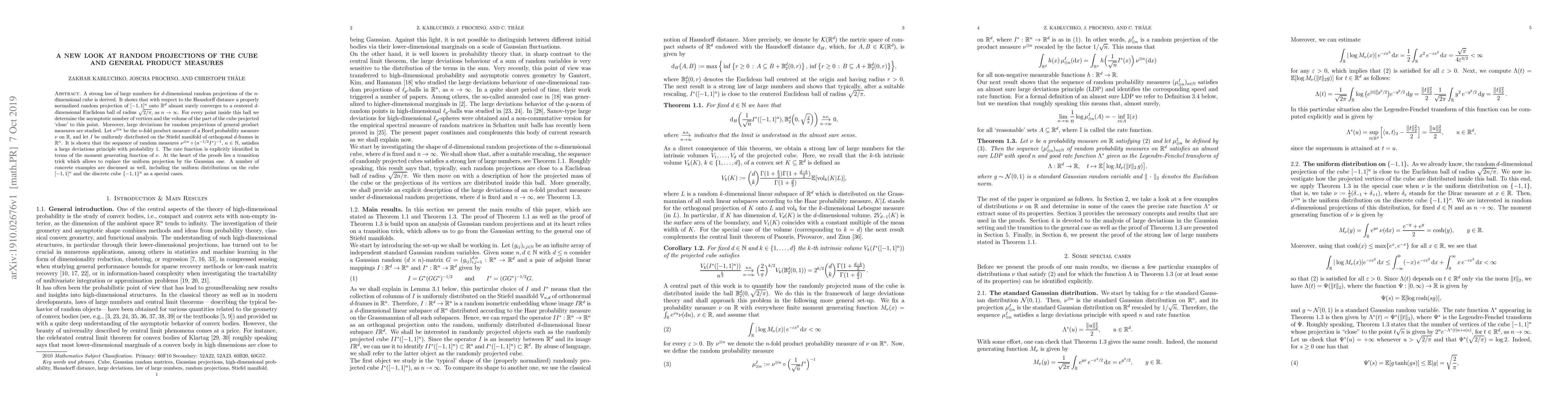 A strong law of large numbers for $d$-dimensional random projections of the $n$-dimensional cube is derived. It shows that with respect to the Hausdorff distance a properly normalized random projection of $[-1,1]^n$ onto $\mathbb{R}^d$ almost surely converges to a centered $d$-dimensional Euclidean ball of radius $\sqrt{2/\pi}$, as $n\to\infty$. For every point inside this ball we determine the asymptotic number of vertices and the volume of the part of the cube projected `close' to this point. Moreover, large deviations for random projections of general product measures are studied. Let $\nu^{\otimes n}$ be the $n$-fold product measure of a Borel probability measure $\nu$ on $\mathbb{R}$, and let $I$ be uniformly distributed on the Stiefel manifold of orthogonal $d$-frames in $\mathbb{R}^n$. It is shown that the sequence of random measures $\nu^{\otimes n}\circ(n^{-1/2}I^*)^{-1}$, $n\in\mathbb{N}$, satisfies a large deviations principle with probability $1$. The rate function is explicitly identified in terms of the moment generating function of $\nu$. At the heart of the proofs lies a transition trick which allows to replace the uniform projection by the Gaussian one. A number of concrete examples are discussed as well, including the uniform distributions on the cube $[-1,1]^n$ and the discrete cube $\{-1,1\}^n$ as a special cases.