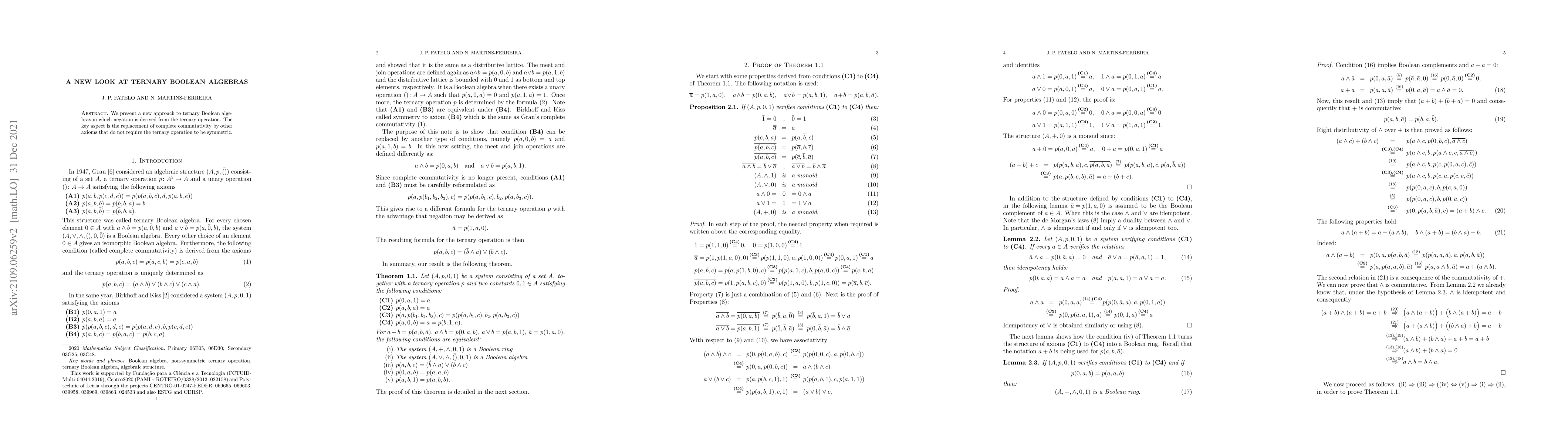 Summary: This paper introduces an innovative method for ternary Boolean algebras where negation is defined via a ternary operation, abandoning complete commutativity in favor of alternative axioms that do not necessitate symmetry in the ternary operation.