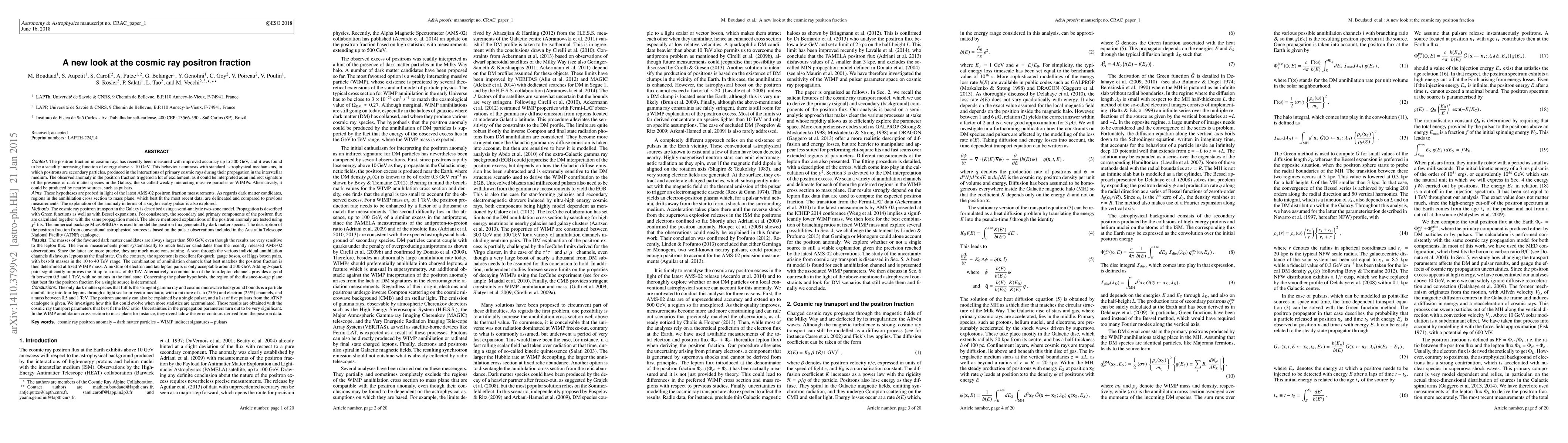 The positron fraction in cosmic rays was found to be a steadily increasing in function of energy, above $\sim$ 10 GeV. This behaviour contradicts standard astrophysical mechanisms, in which positrons are secondary particles, produced in the interactions of primary cosmic rays during the propagation in the interstellar medium. The observed anomaly in the positron fraction triggered a lot of excitement, as it could be interpreted as an indirect signature of the presence of dark matter species in the Galaxy. Alternatively, it could be produced by nearby astrophysical sources, such as pulsars. Both hypotheses are probed in this work in light of the latest AMS-02 positron fraction measurements. The transport of the primary and secondary positrons in the Galaxy is described using a semi-analytic two-zone model. MicrOMEGAs is used to model the positron flux generated by dark matter species. The description of the positron fraction from astrophysical sources is based on the pulsar observations included in the ATNF catalogue. We find that the mass of the favoured dark matter candidates is always larger than 500 GeV. The only dark matter species that fulfils the numerous gamma ray and cosmic microwave background bounds is a particle annihilating into four leptons through a light scalar or vector mediator, with a mixture of tau (75%) and electron (25%) channels, and a mass between 0.5 and 1 TeV. The positron anomaly can also be explained by a single astrophysical source and a list of five pulsars from the ATNF catalogue is given. Those results are obtained with the cosmic ray transport parameters that best fit the B/C ratio. Uncertainties in the propagation parameters turn out to be very significant. In the WIMP annihilation cross section to mass plane for instance, they overshadow the error contours derived from the positron data.