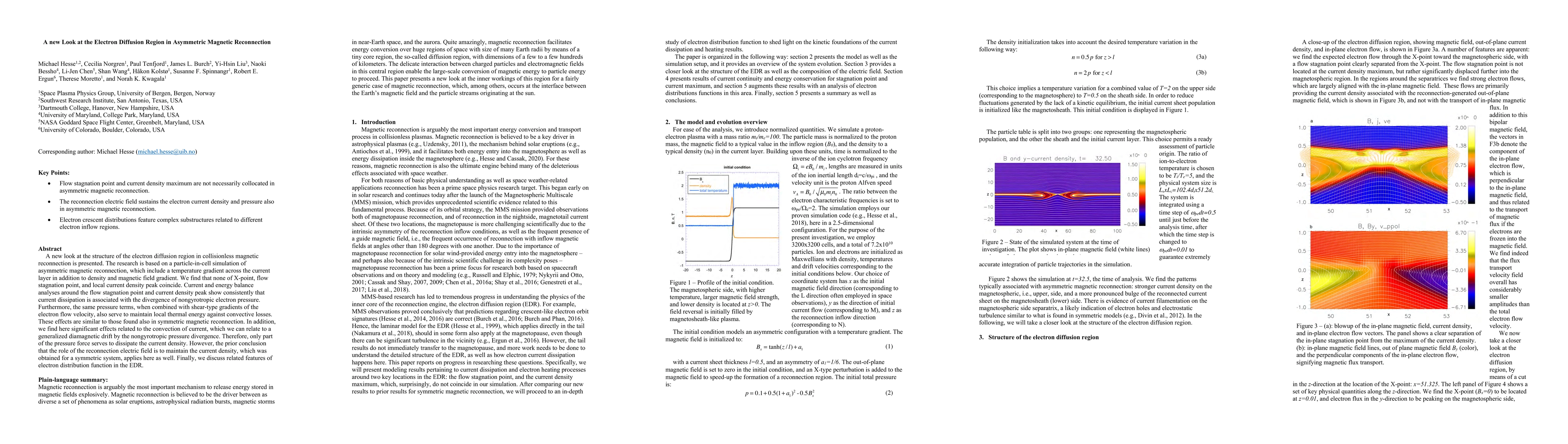 This paper presents a particle-in-cell simulation of asymmetric magnetic reconnection, revealing that current dissipation is linked to the divergence of nongyrotropic electron pressure, while the same pressure terms, combined with shear-type gradients, maintain thermal energy. The study also highlights the significant role of generalized diamagnetic drift in current convection.