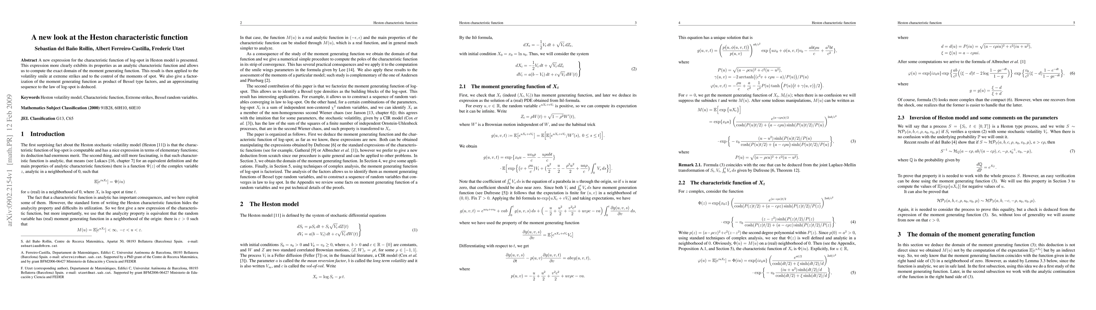 This paper presents a new expression for the Heston model's characteristic function, elucidating its analytic properties and enabling precise computation of the moment generating function's domain. It applies these findings to analyze the volatility smile and control spot moments, with a factorization into Bessel type factors and an approximation sequence for the log-spot law.