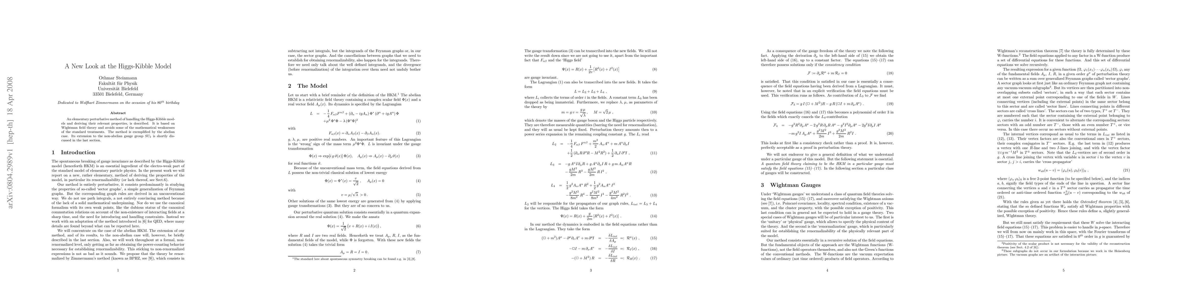 An elementary perturbative method of handling the Higgs-Kibble models and deriving their relevant properties, is described. It is based on Wightman field theory and avoids some of the mathematical weaknesses of the standard treatments.